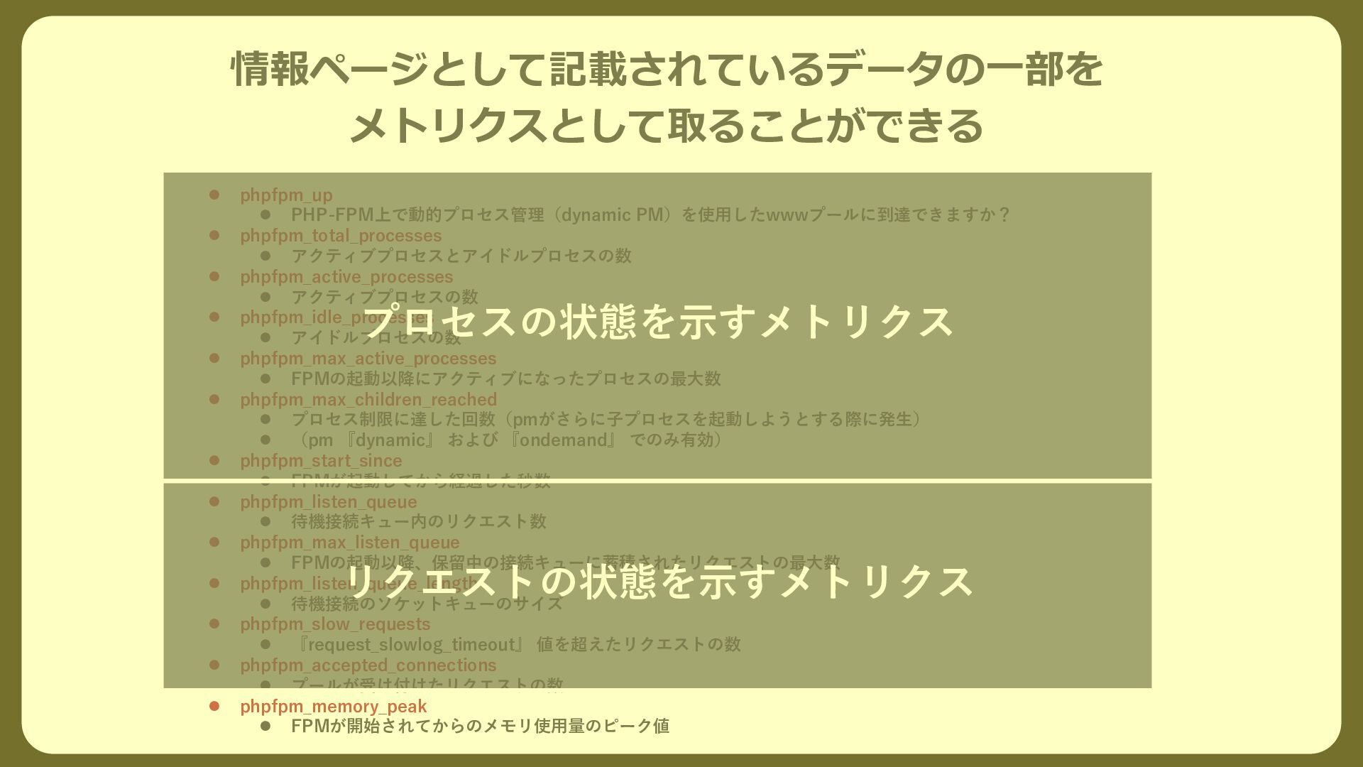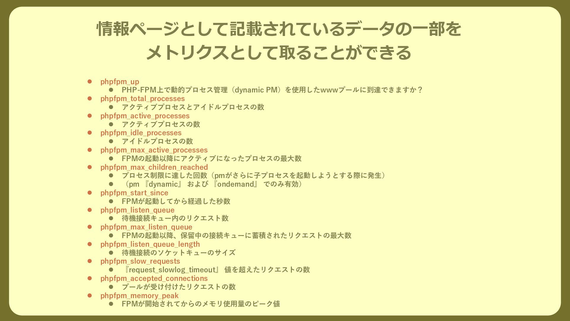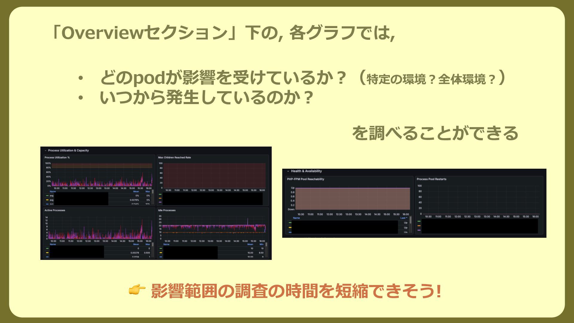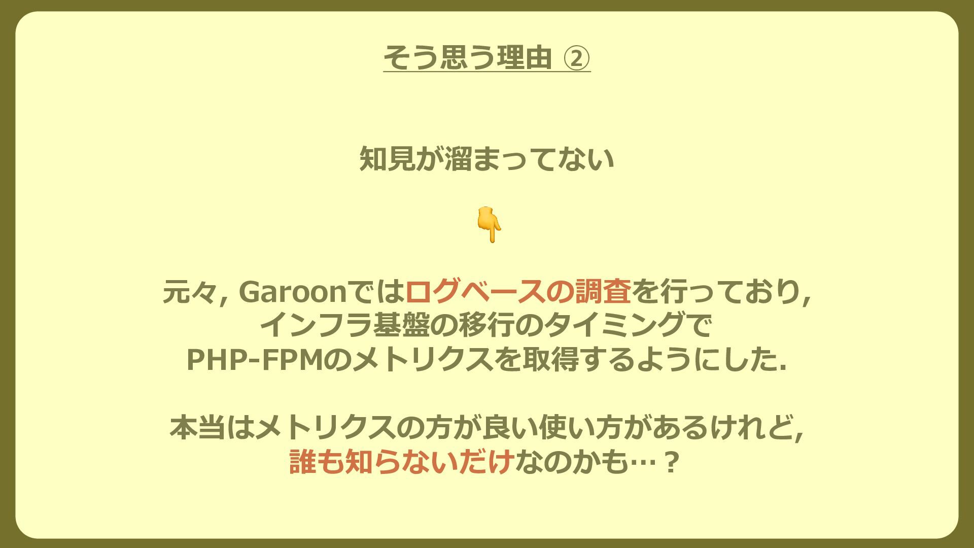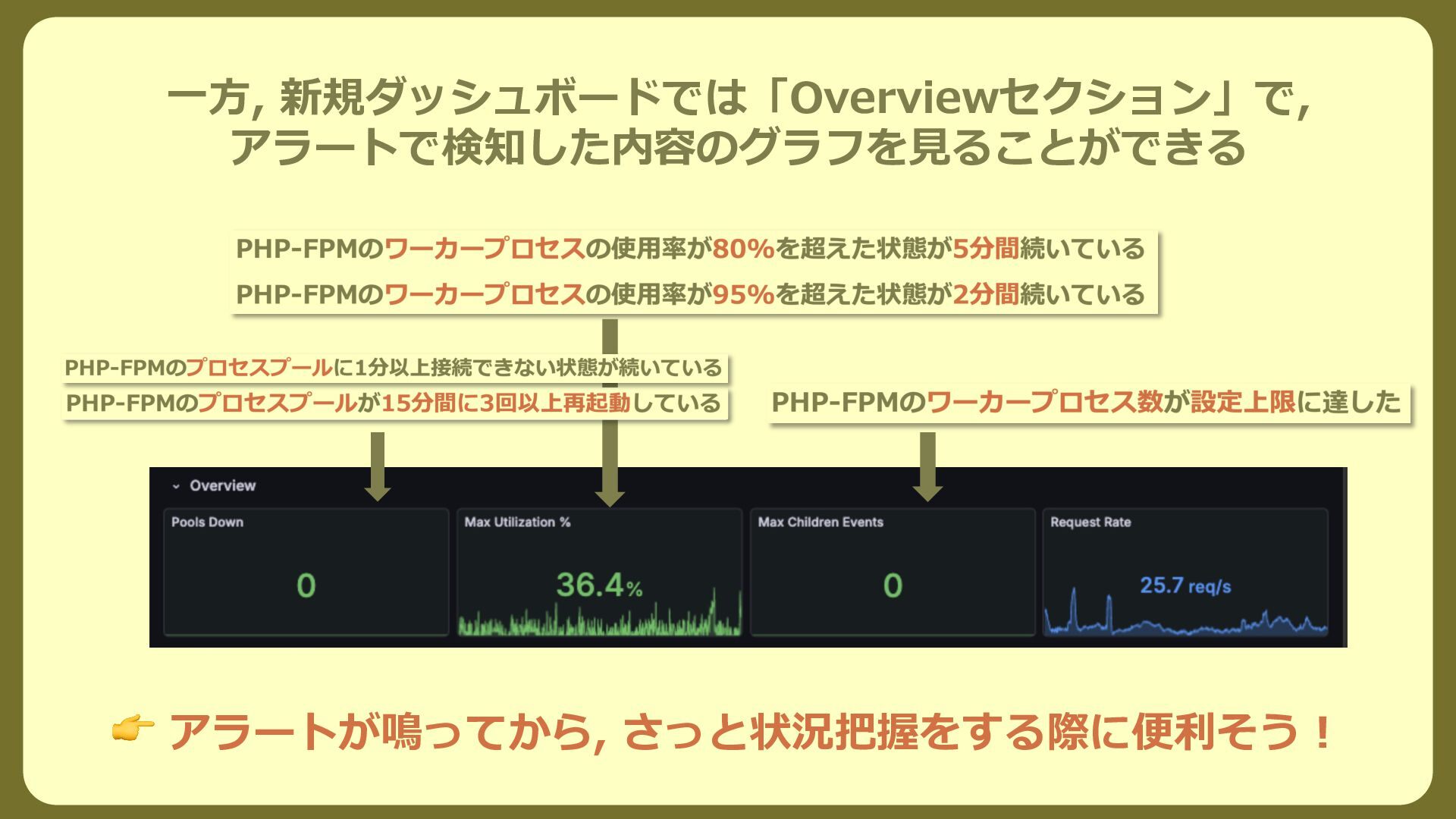 それなりに時間がかかる • アラートやダッシュボードのユースケースを整理して, 本当にそのユースケースを満たしているのか, を軸としながら壁打ちをすると良いのかも. • とはいえ, 「ユースケースを考えて」, 「メトリクスの意味を理解して」, 「適したアラートを作って」, 「⾒やすいダッシュボードを作って」という作業のうち, 後ろ3つの作業はある程度お任せできそうな ので, 楽はできそう. • モデル次第の可能性もある. • PHP-FPMのメトリクスだから良かった可能性もある. • 取得できるメトリクスは公開されているので, 「メトリクスの意味の理解」しやすく, AI Agentも作りやすかった可能性がある. • 独⾃で作成したメトリクスの場合だと, もう少し事前に情報を提供しておく必要があるのかも