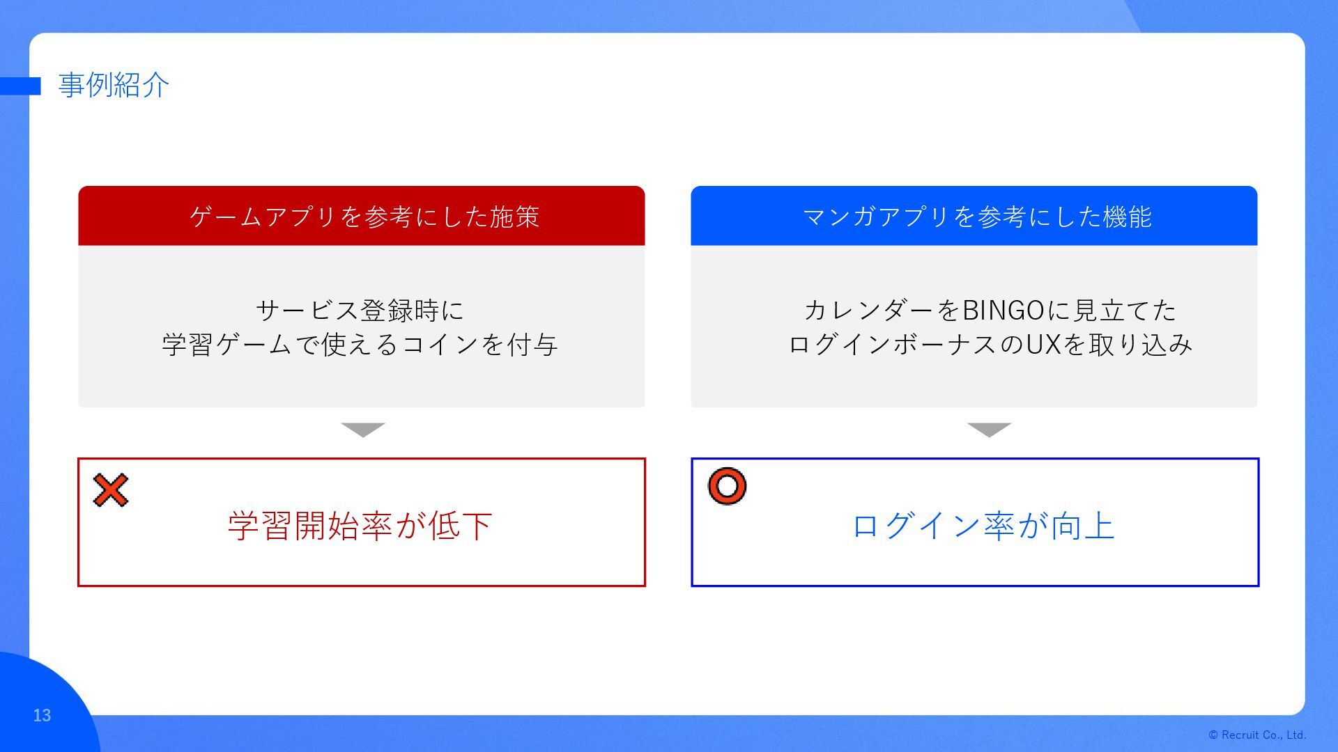 5. © Recruit Co., Ltd. 13 事例紹介 ゲームアプリを参考にした施策 マンガアプリを参考にした機能 サービス登録時に 学習ゲームで使えるコインを付与
