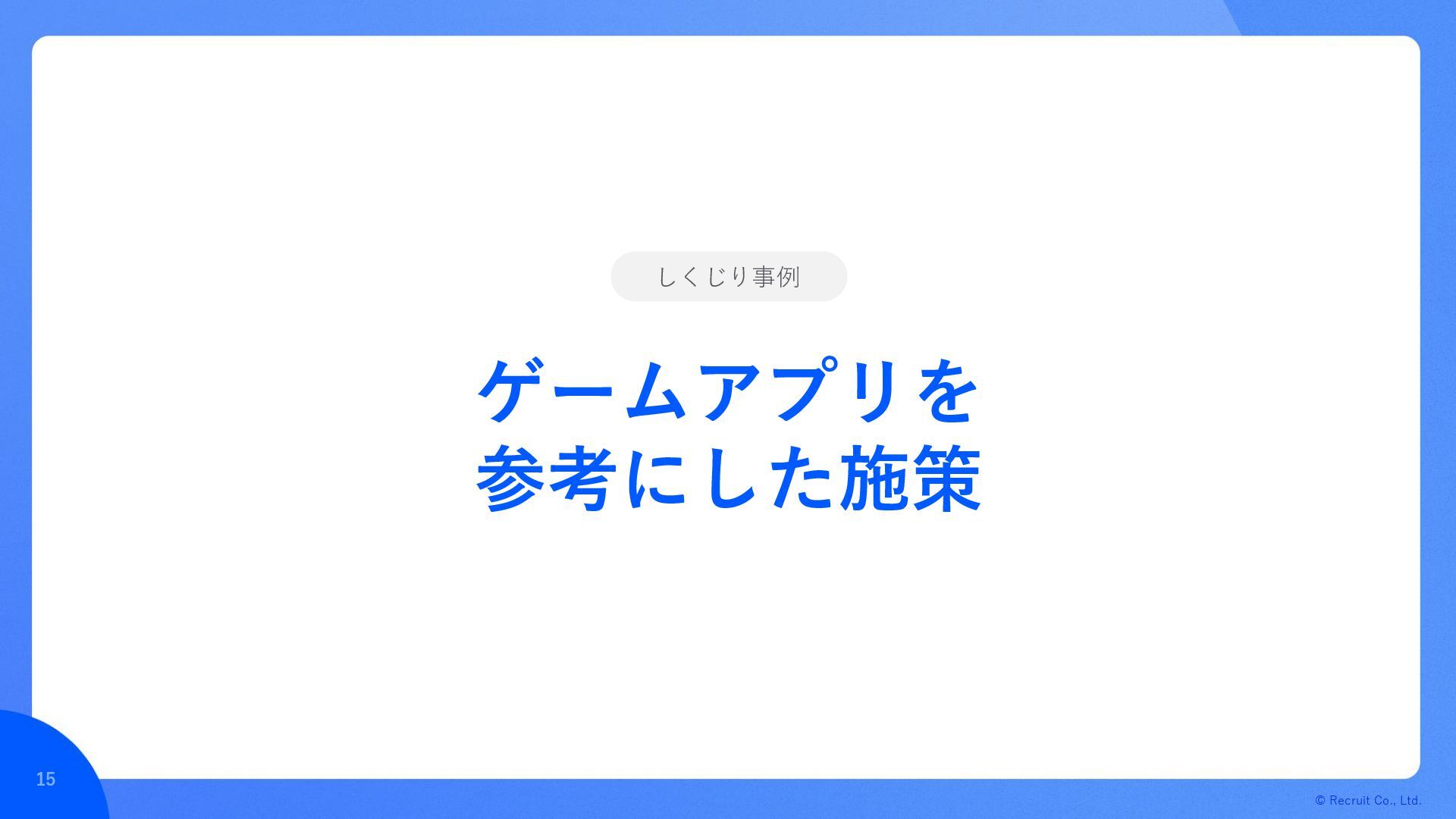 6. © Recruit Co., Ltd. 14 事例紹介 ゲームアプリを参考にした施策 マンガアプリを参考にした機能 サービス登録時に 学習ゲームで使えるコインを付与