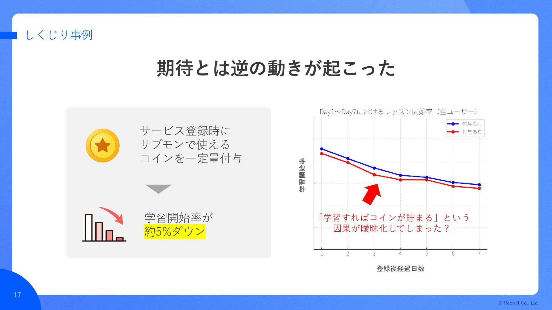 8. © Recruit Co., Ltd. 17 しくじり事例 サービス登録時に サプモンで使える コインを一定量付与 学習開始率が