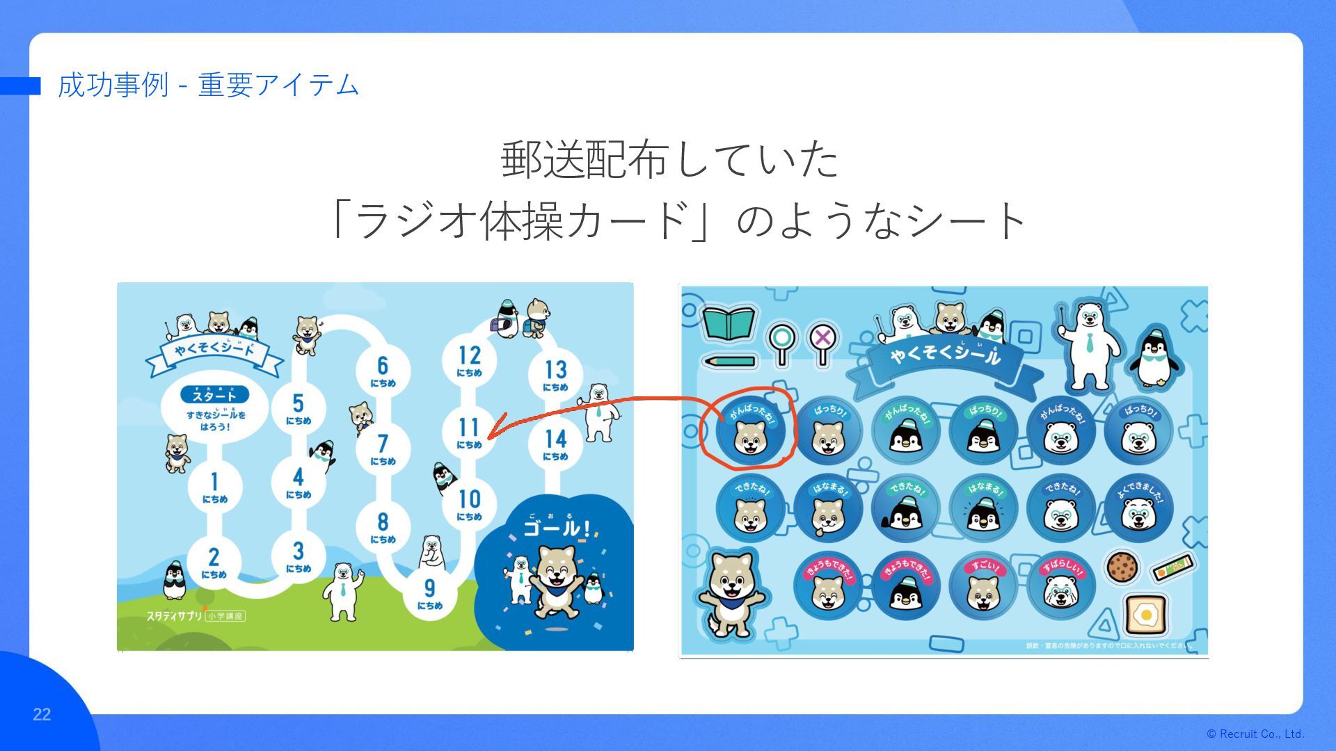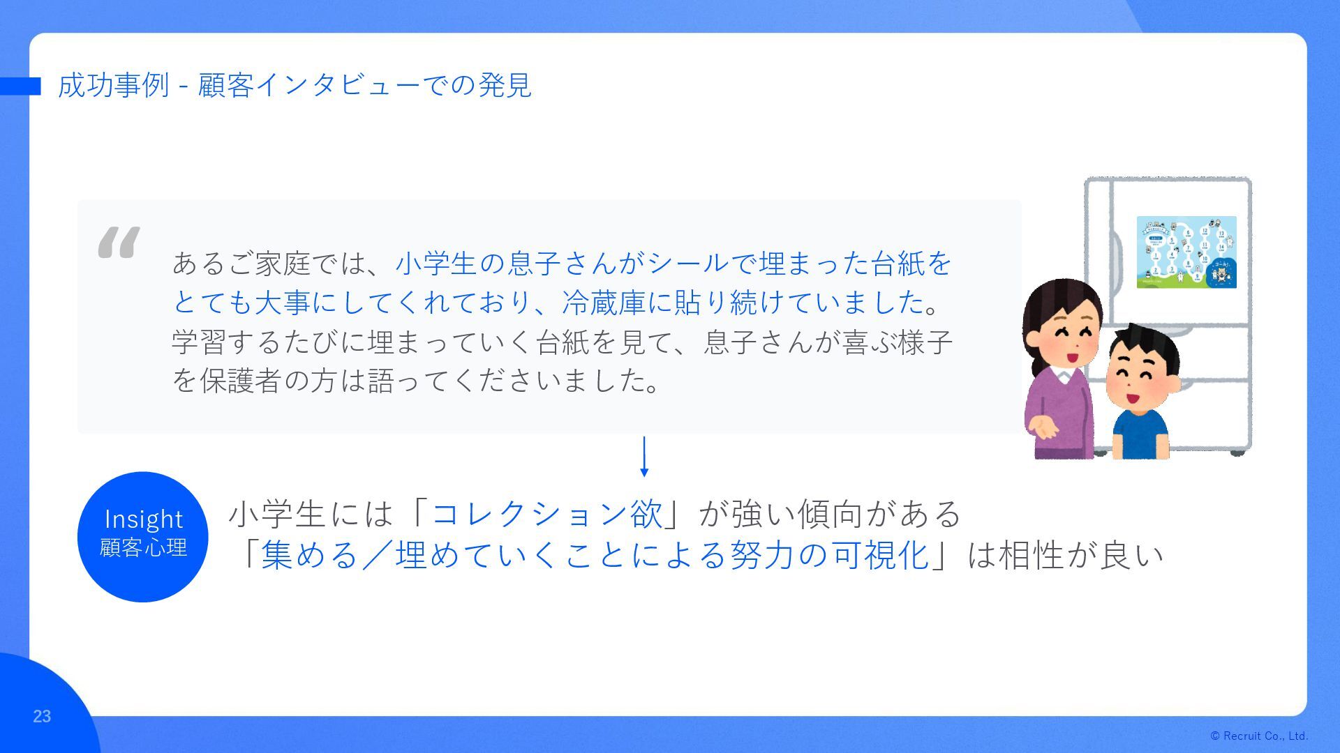 11. © Recruit Co., Ltd. 23 成功事例 - 顧客インタビューでの発見 “ あるご家庭では、小学生の息子さんがシールで埋まった台紙を