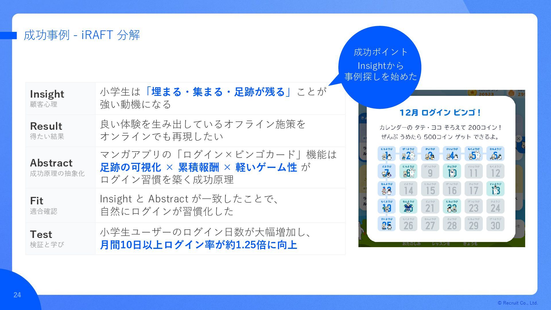顧客心理 小学生は「埋まる・集まる・足跡が残る」ことが 強い動機になる Result 得たい結果 良い体験を生み出しているオフライン施策を オンラインでも再現したい Abstract 成功原理の抽象化 マンガアプリの「ログイン×ビンゴカード」機能は 足跡の可視化 × 累積報酬 × 軽いゲーム性 が ログイン習慣を築く成功原理 Fit 適合確認 Insight と Abstract が一致したことで、 自然にログインが習慣化した Test 検証と学び 小学生ユーザーのログイン日数が大幅増加し、 月間10日以上ログイン率が約1.25倍に向上 成功ポイント Insightから 事例探しを始めた
