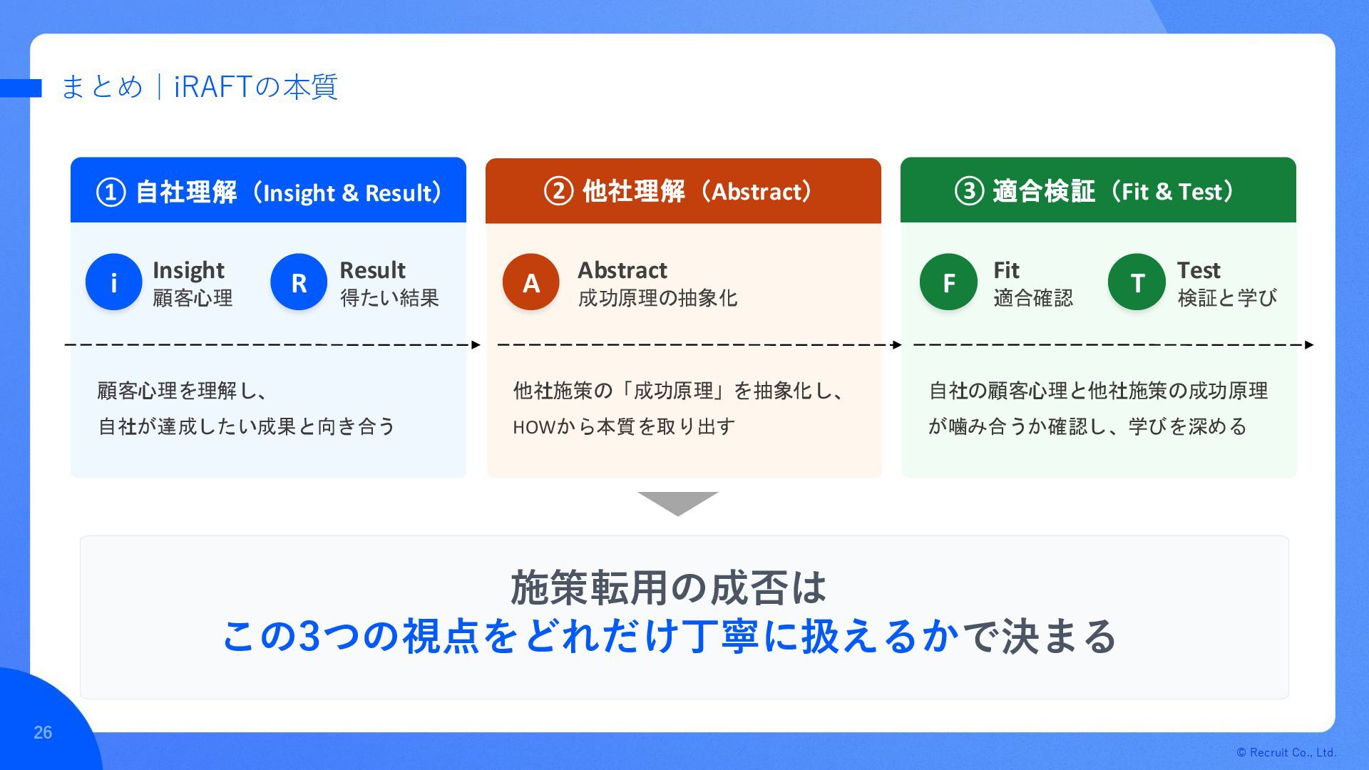 13. © Recruit Co., Ltd. 26 まとめ|iRAFTの本質 施策転用の成否は この3つの視点をどれだけ丁寧に扱えるかで決まる 顧客心理を理解し、 自社が達成したい成果と向き合う