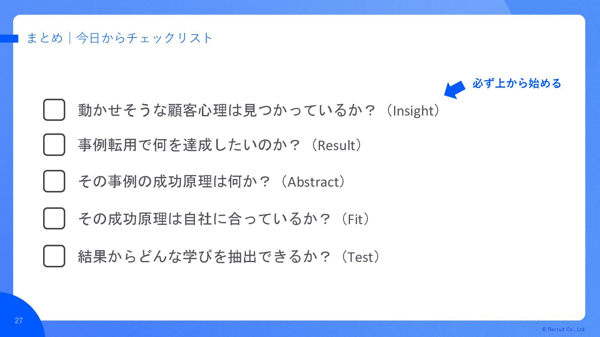 他社施策の「成功原理」を抽象化し、 HOWから本質を取り出す 自社の顧客心理と他社施策の成功原理 が噛み合うか確認し、学びを深める i Insight 顧客心理 R Result 得たい結果 A Abstract 成功原理の抽象化 F Fit 適合確認 T Test 検証と学び ① 自社理解(Insight & Result) ② 他社理解(Abstract) ③ 適合検証(Fit & Test)