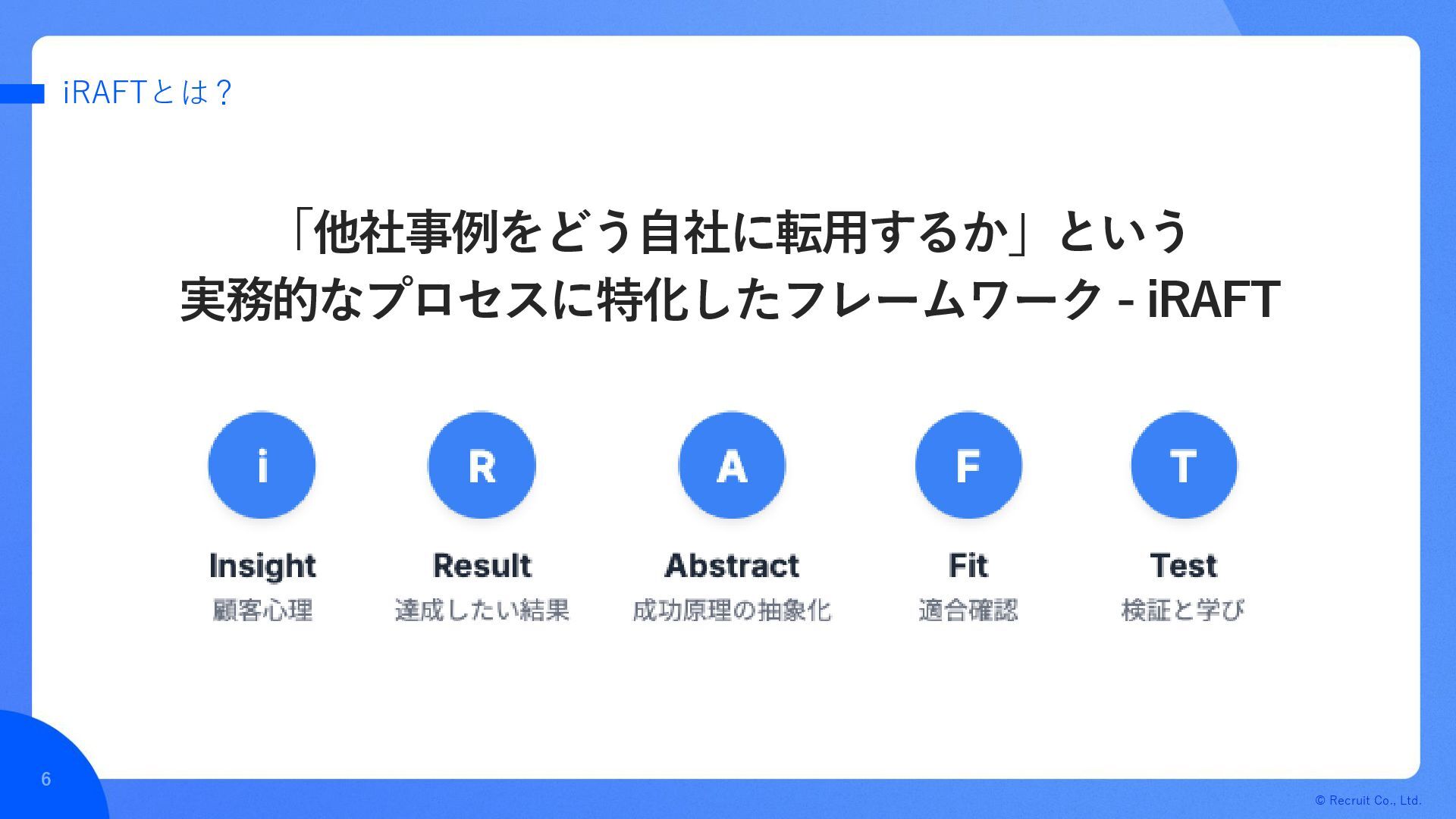 が噛み合うか確認し、学びを深める i Insight 顧客心理 R Result 得たい結果 A Abstract 成功原理の抽象化 F Fit 適合確認 T Test 検証と学び ① 自社理解(Insight & Result) ② 他社理解(Abstract) ③ 適合検証(Fit & Test) 最後に検証して、学びを深める iRAFT:他社施策を自社に取り込む翻訳プロセス