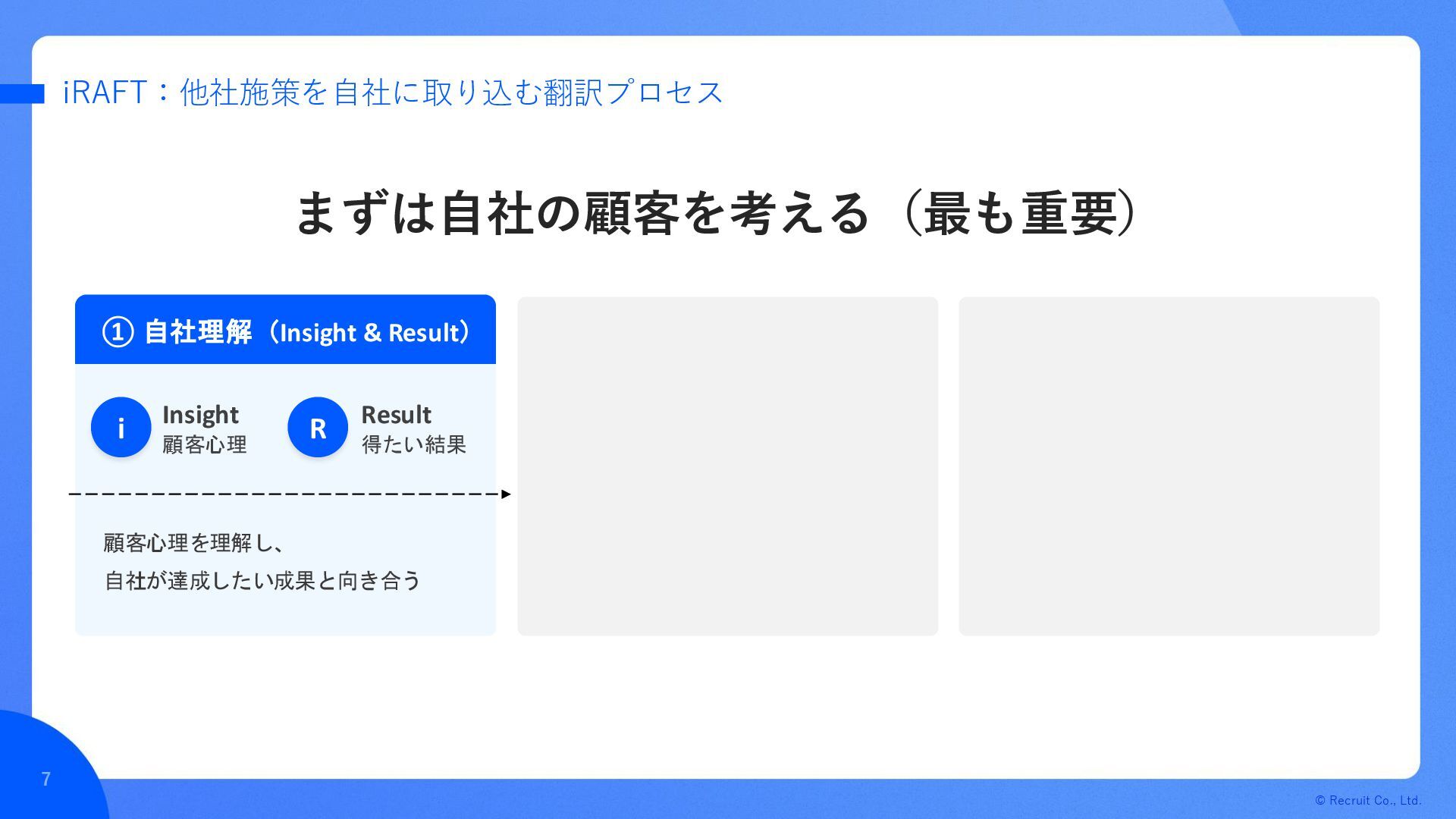 R Result 得たい結果 ① 自社理解(Insight & Result) まずは自社の顧客を考える(最も重要) iRAFT:他社施策を自社に取り込む翻訳プロセス