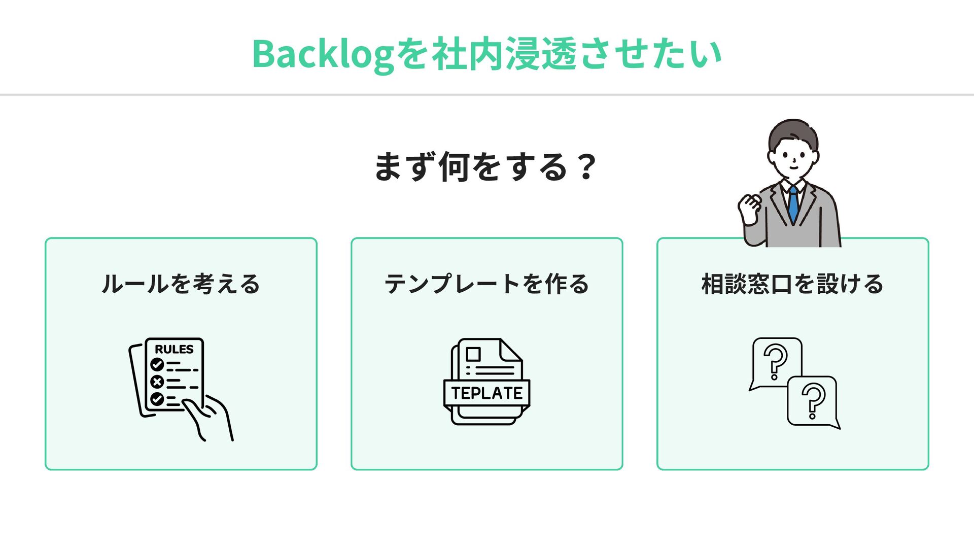 Backlogを社内浸透させたい まず何をする? ルールを考える テンプレートを作る 相談窓口を設ける