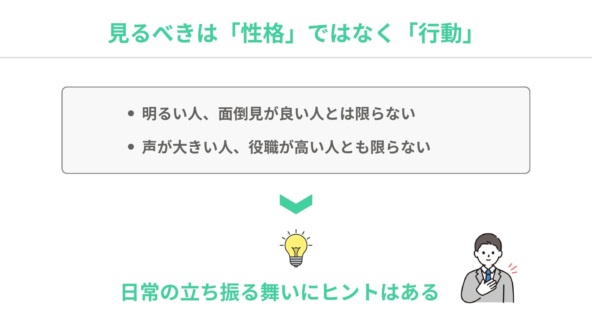 見るべきは「性格」ではなく「行動」 明るい人、面倒見が良い人とは限らない 声が大きい人、役職が高い人とも限らない 日常の立ち振る舞いにヒントはある
