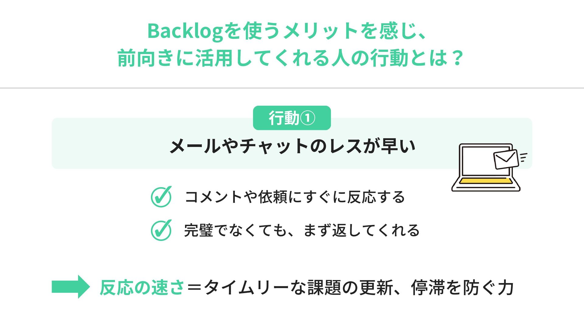 Backlogを使うメリットを感じ、 前向きに活用してくれる人の行動とは? 行動① メールやチャットのレスが早い コメントや依頼にすぐに反応する 完璧でなくても、まず返してくれる 反応の速さ=タイムリーな課題の更新、停滞を防ぐ力