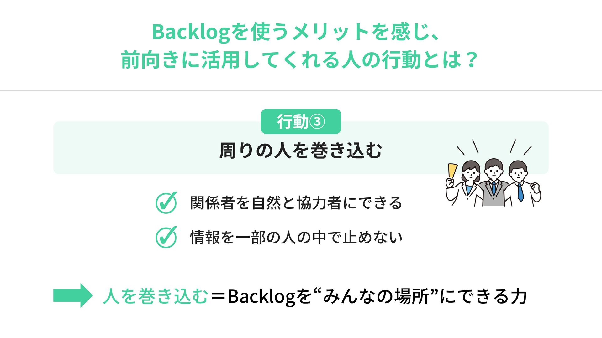 Backlogを使うメリットを感じ、 前向きに活用してくれる人の行動とは? 行動③ 周りの人を巻き込む 関係者を自然と協力者にできる 情報を一部の人の中で止めない 人を巻き込む=Backlogを“みんなの場所”にできる力