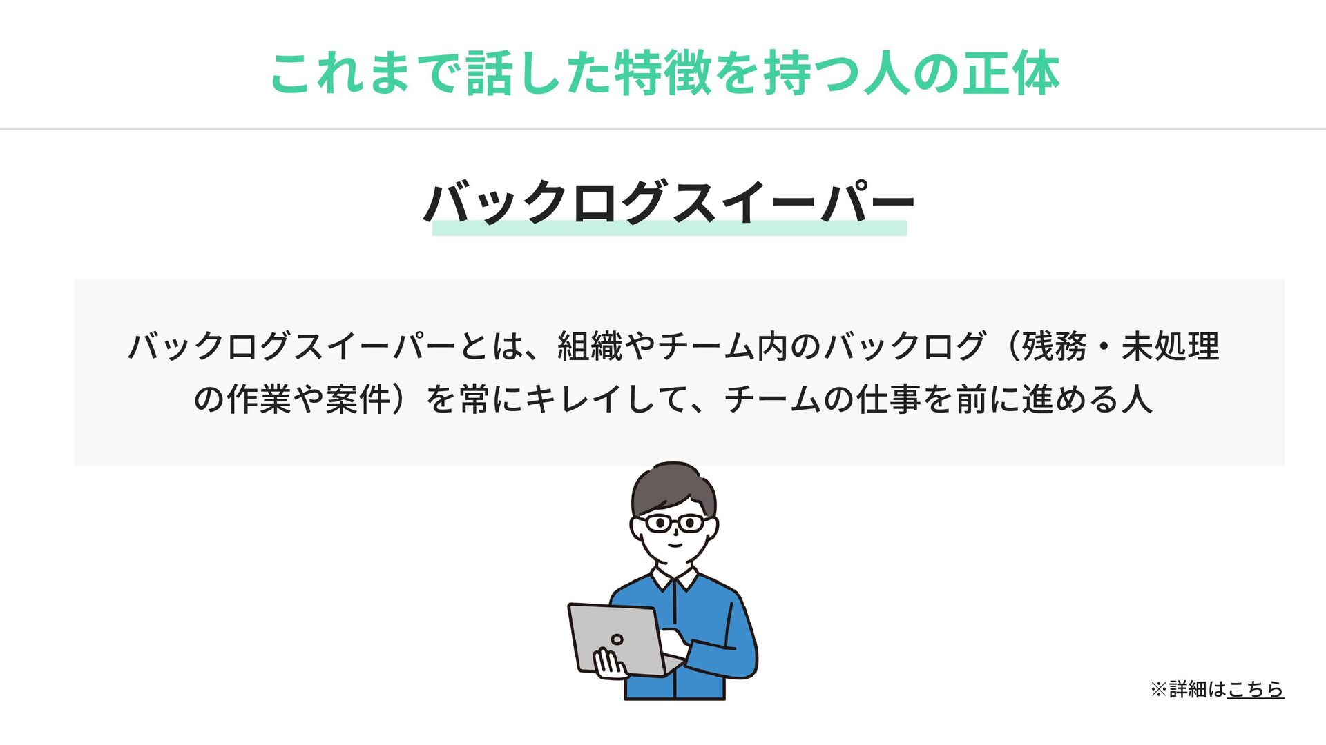 これまで話した特徴を持つ人の正体 バックログスイーパー バックログスイーパーとは、組織やチーム内のバックログ(残務・未処理 の作業や案件)を常にキレイして、チームの仕事を前に進める人 ※詳細はこちら