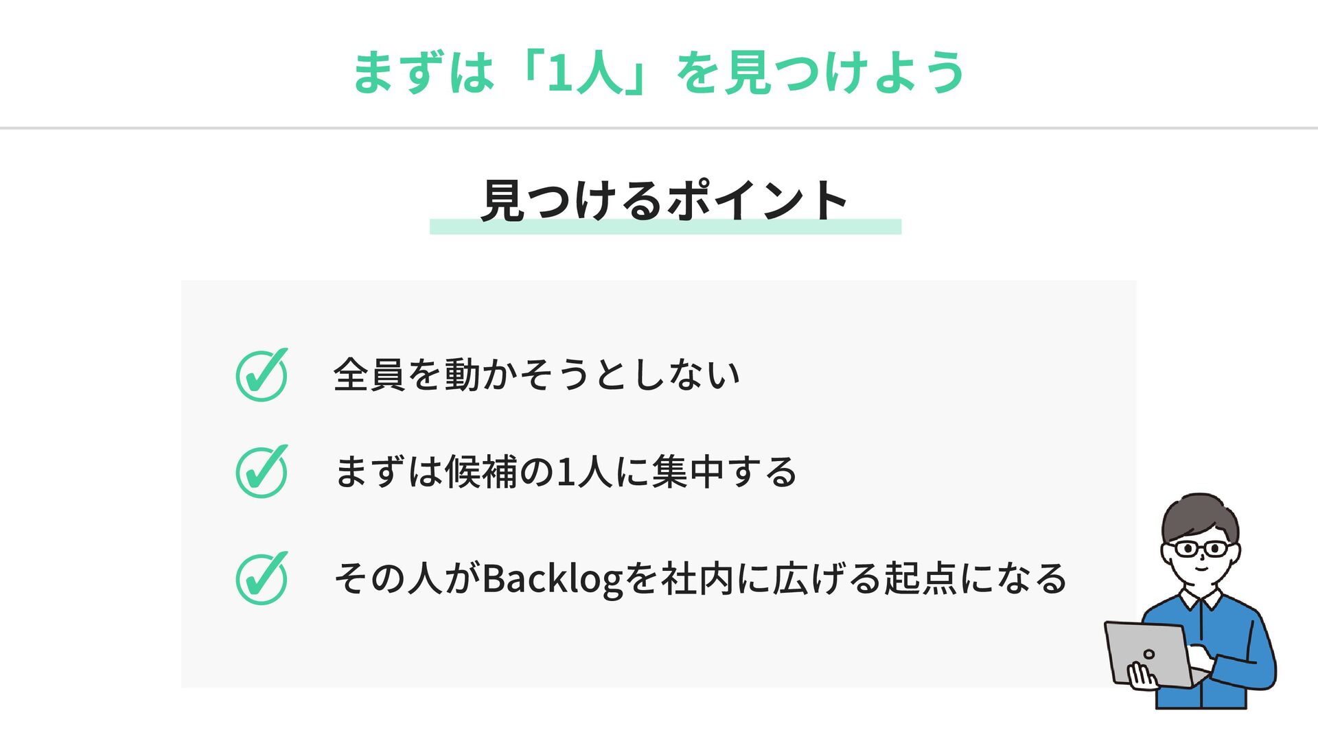 まずは「1人」を見つけよう 見つけるポイント 全員を動かそうとしない まずは候補の1人に集中する その人がBacklogを社内に広げる起点になる