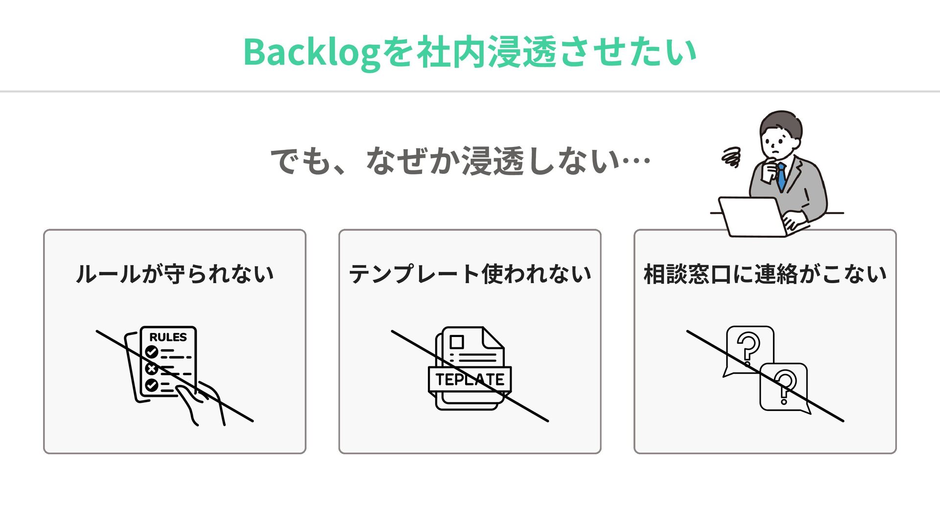 Backlogを社内浸透させたい でも、なぜか浸透しない… ルールが守られない テンプレート使われない 相談窓口に連絡がこない