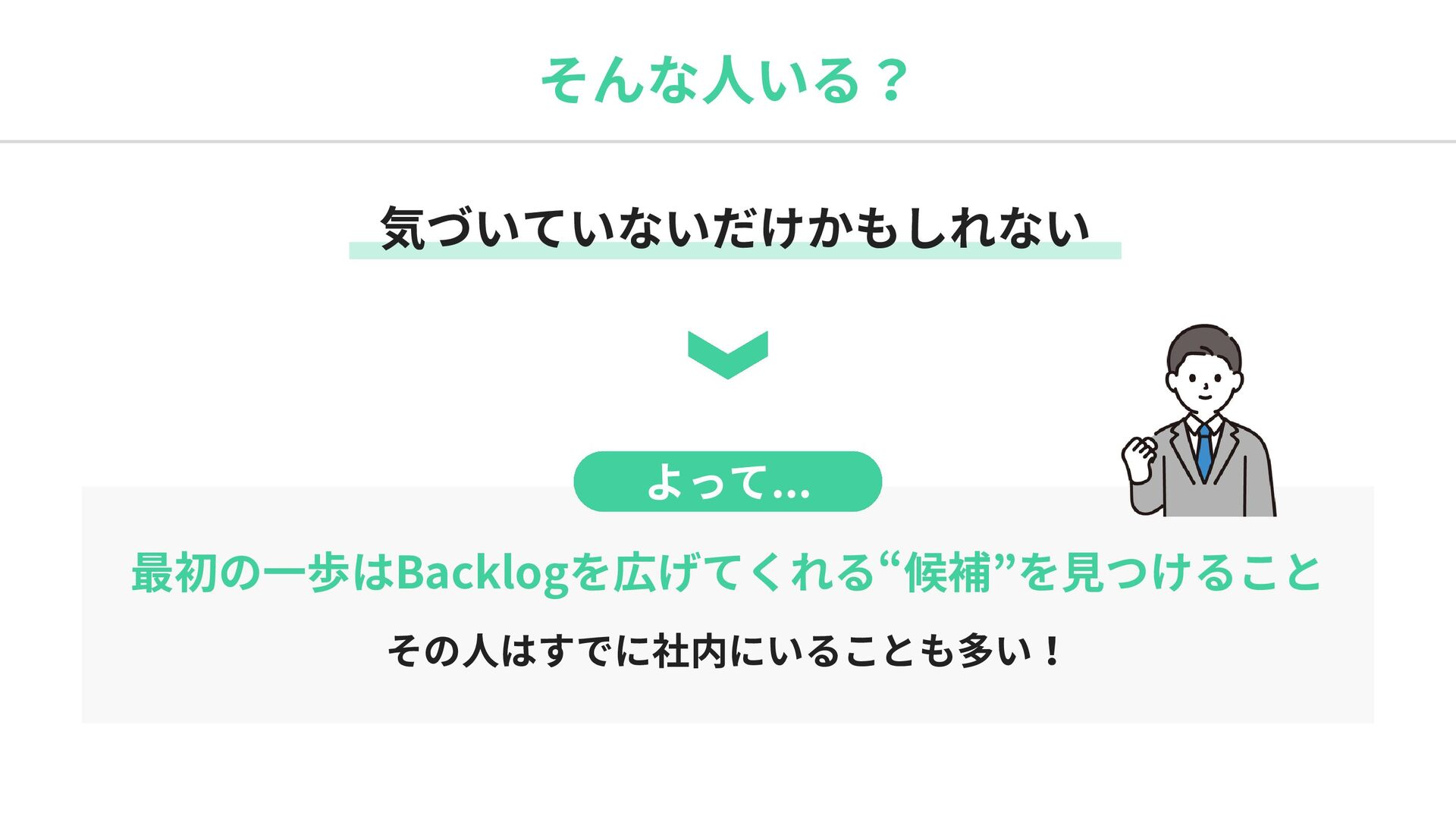 そんな人いる? よって... 気づいていないだけかもしれない 最初の一歩はBacklogを広げてくれる“候補”を見つけること その人はすでに社内にいることも多い!