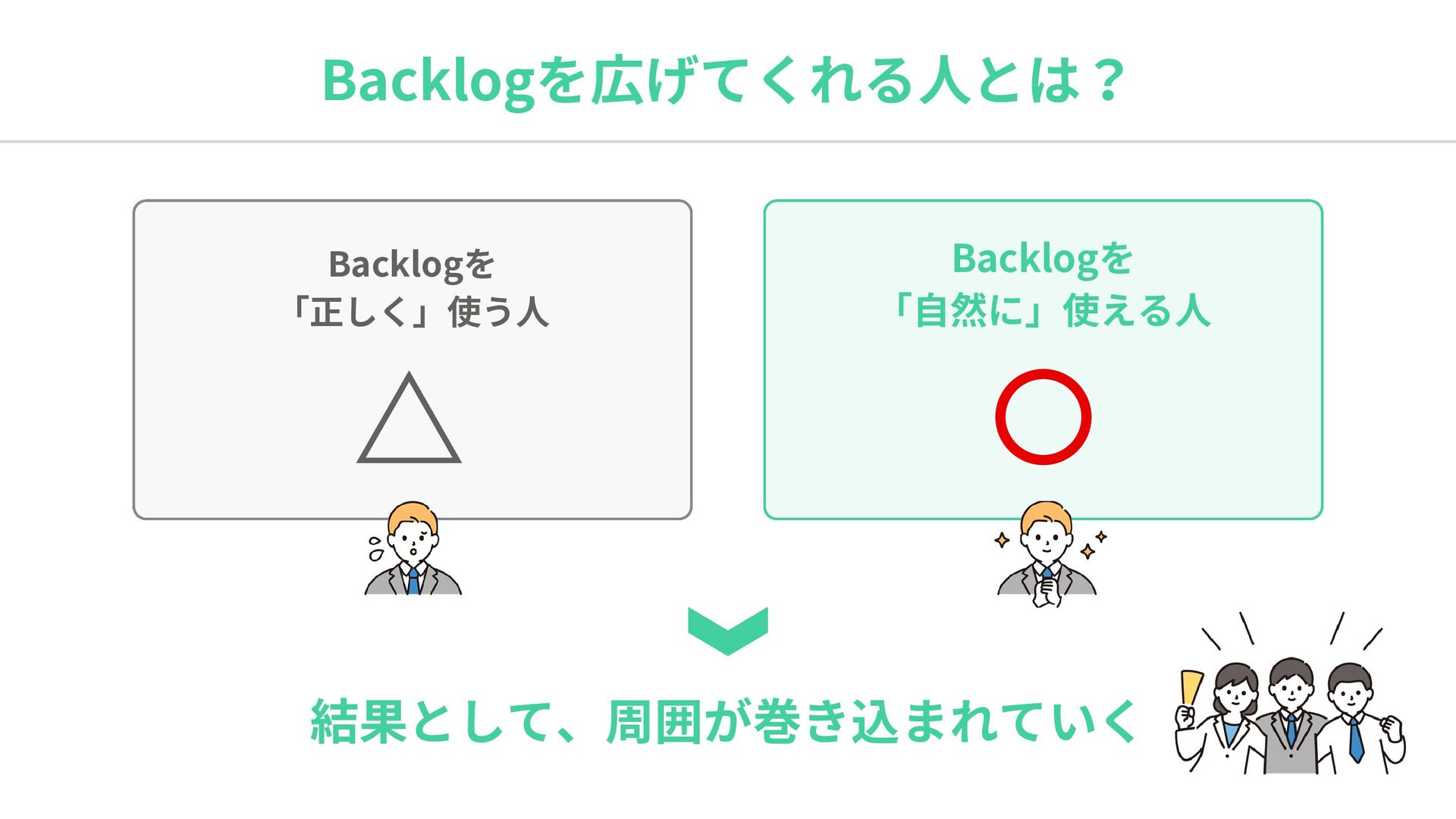 Backlogを広げてくれる人とは? Backlogを 「正しく」使う人 Backlogを 「自然に」使える人 結果として、周囲が巻き込まれていく