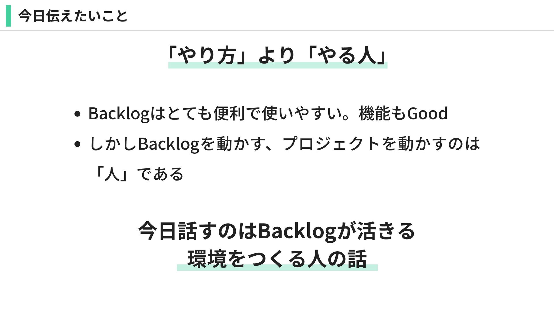 Backlogはとても便利で使いやすい。機能もGood しかしBacklogを動かす、プロジェクトを動かすのは 「人」である 「やり方」より「やる人」 今日伝えたいこと 今日話すのはBacklogが活きる 環境をつくる人の話