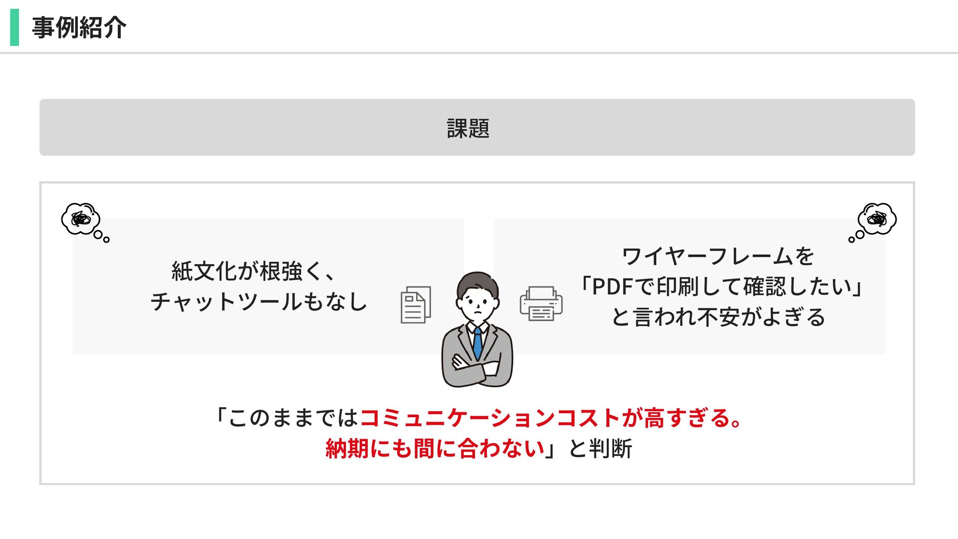 事例紹介 「このままではコミュニケーションコストが高すぎる。 納期にも間に合わない」と判断 紙文化が根強く、 チャットツールもなし ワイヤーフレームを 「PDFで印刷して確認したい」 と言われ不安がよぎる 課題