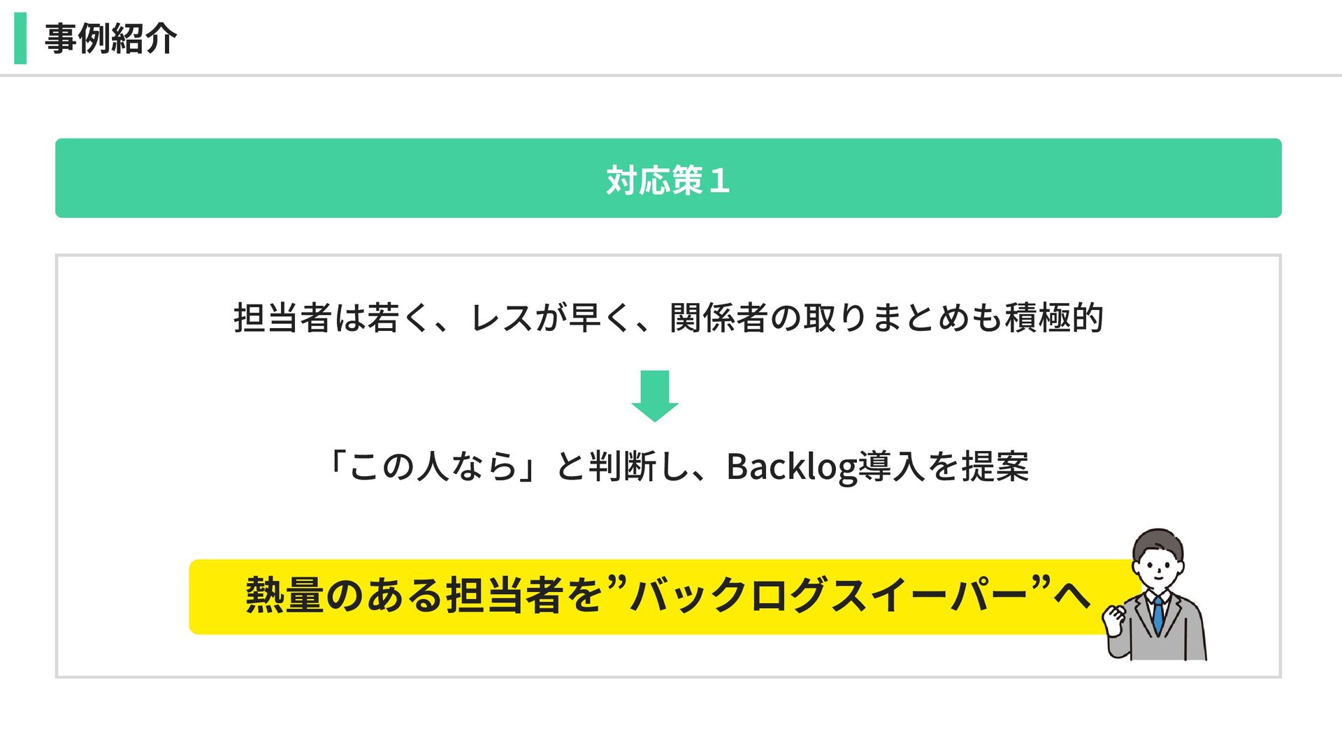 事例紹介 対応策1 担当者は若く、レスが早く、関係者の取りまとめも積極的 「この人なら」と判断し、Backlog導入を提案 熱量のある担当者を”バックログスイーパー”へ