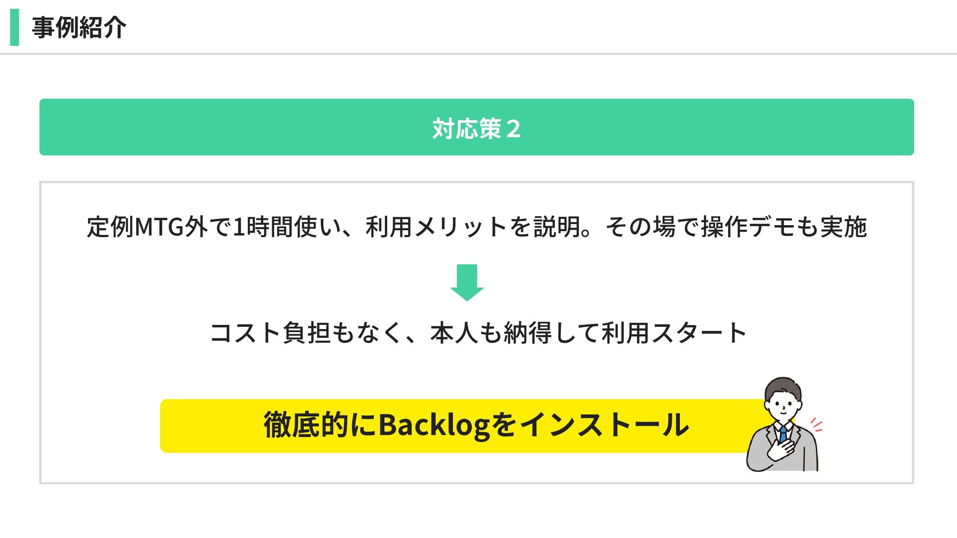徹底的にBacklogをインストール 事例紹介 対応策2 定例MTG外で1時間使い、利用メリットを説明。その場で操作デモも実施 コスト負担もなく、本人も納得して利用スタート