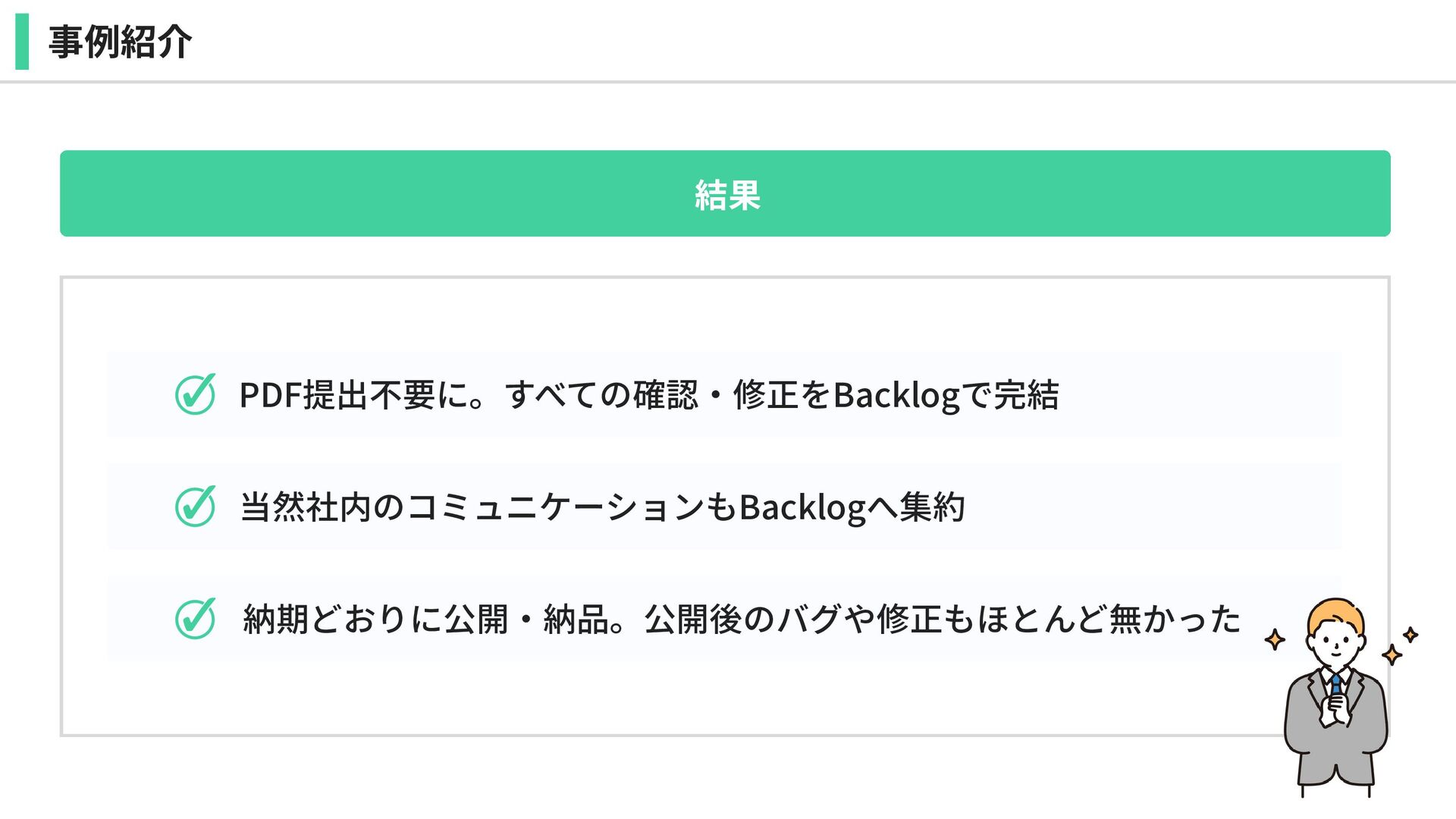 PDF提出不要に。すべての確認・修正をBacklogで完結 当然社内のコミュニケーションもBacklogへ集約 納期どおりに公開・納品。公開後のバグや修正もほとんど無かった 事例紹介 結果