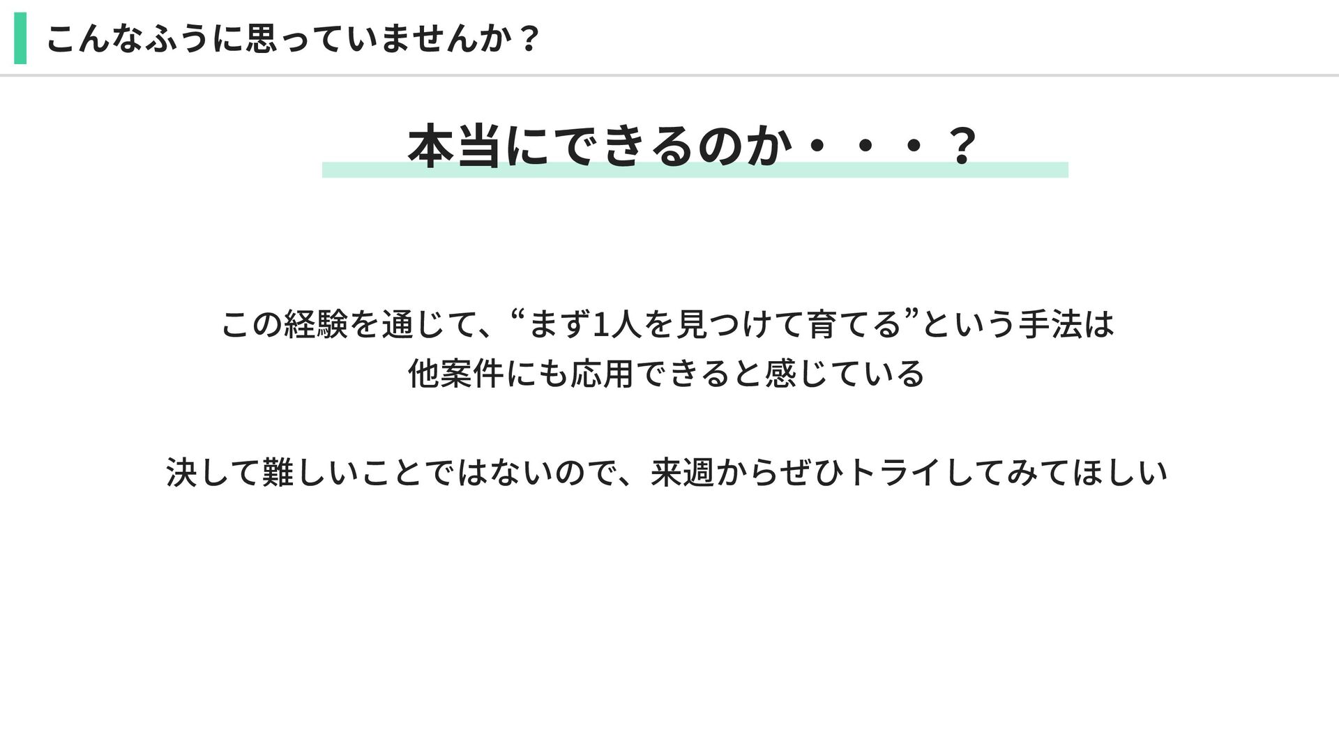 こんなふうに思っていませんか? この経験を通じて、“まず1人を見つけて育てる”という手法は 他案件にも応用できると感じている 決して難しいことではないので、来週からぜひトライしてみてほしい 本当にできるのか・・・?