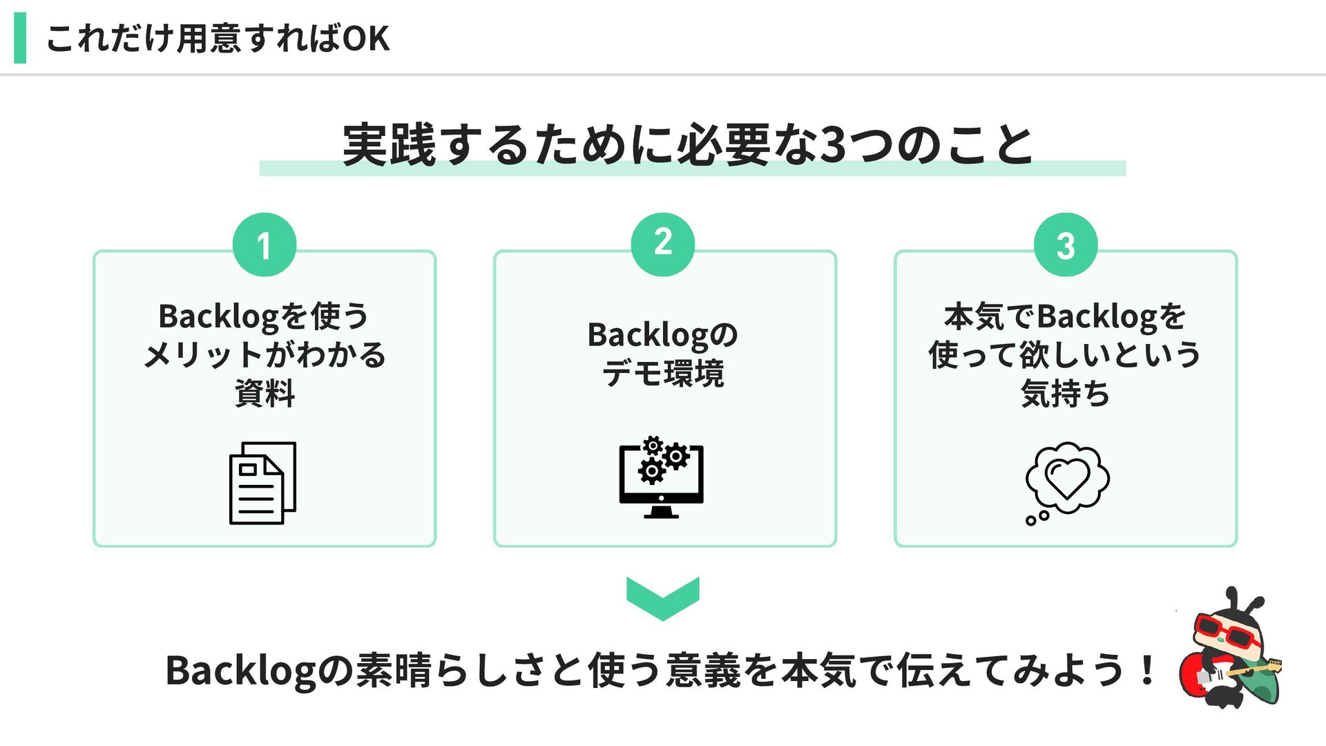 これだけ用意すればOK 実践するために必要な3つのこと Backlogを使う メリットがわかる 資料 1 2 3 Backlogの デモ環境