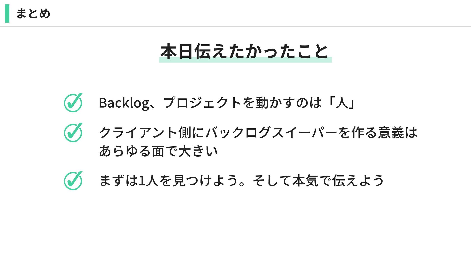 まとめ 本日伝えたかったこと Backlog、プロジェクトを動かすのは「人」 クライアント側にバックログスイーパーを作る意義は あらゆる面で大きい まずは1人を見つけよう。そして本気で伝えよう
