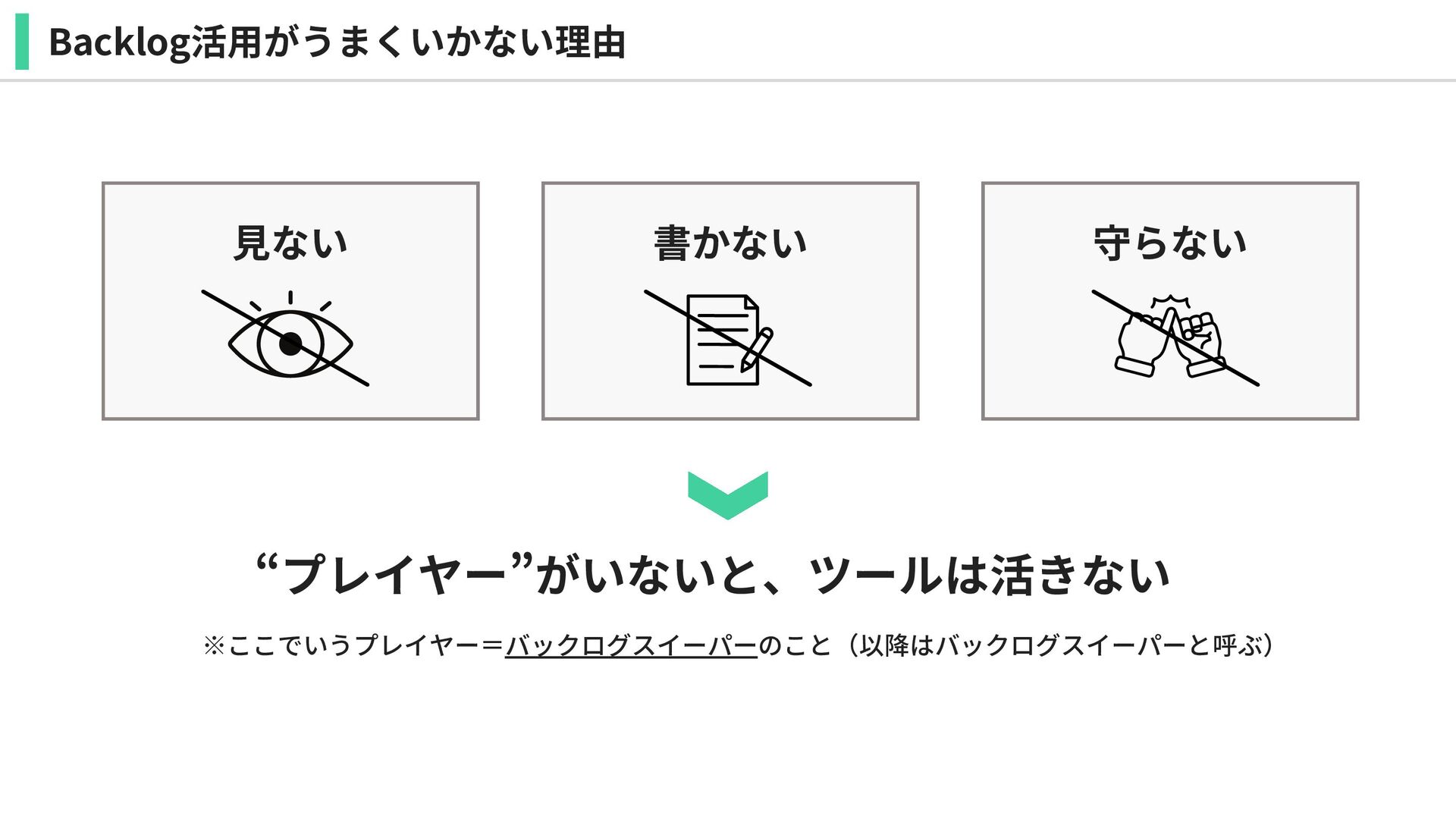 Backlog活用がうまくいかない理由 見ない 書かない 守らない “プレイヤー”がいないと、ツールは活きない ※ここでいうプレイヤー=バックログスイーパーのこと(以降はバックログスイーパーと呼ぶ)