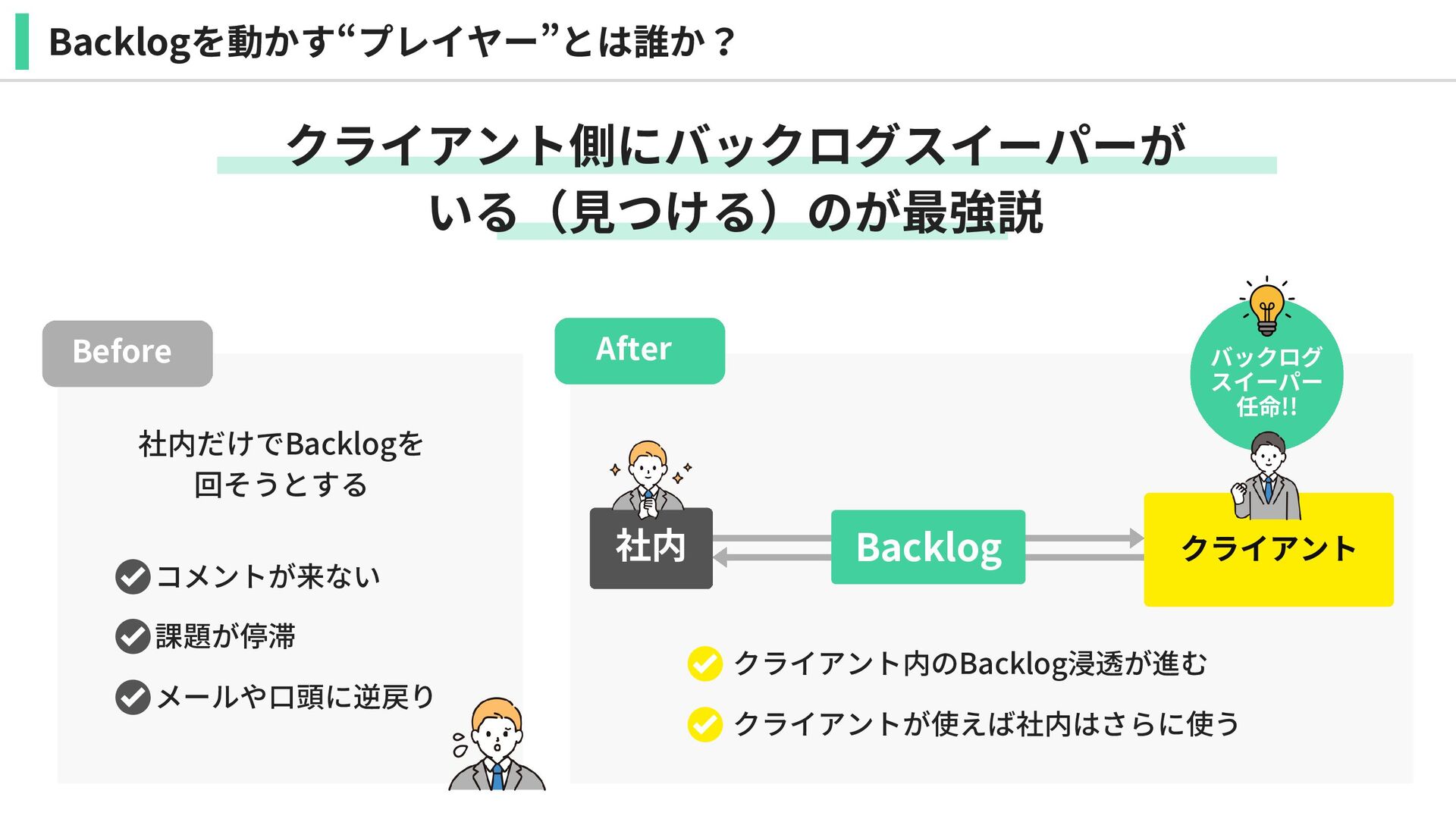 Backlogを動かす“プレイヤー”とは誰か? Before After 社内だけでBacklogを 回そうとする Backlog 社内 クライアント バックログ スイーパー