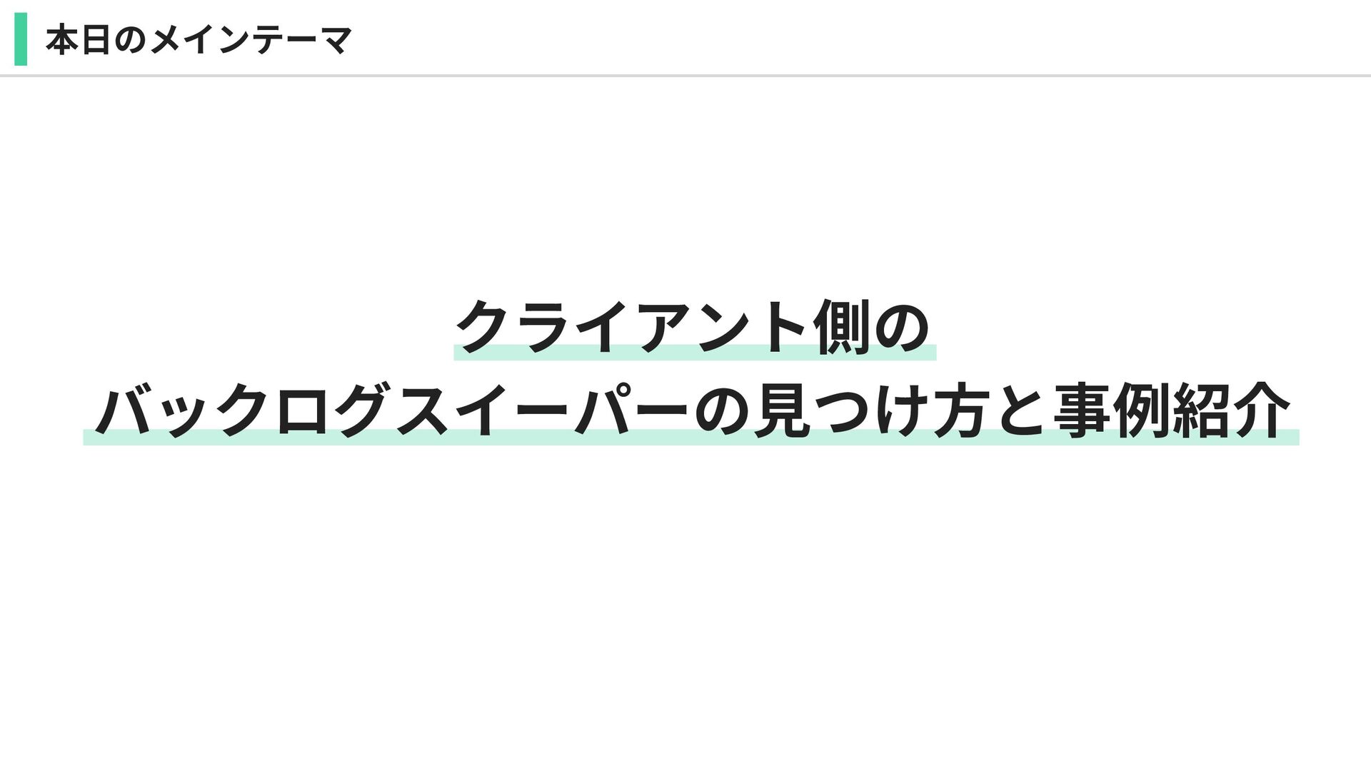 本日のメインテーマ クライアント側の バックログスイーパーの見つけ方と事例紹介
