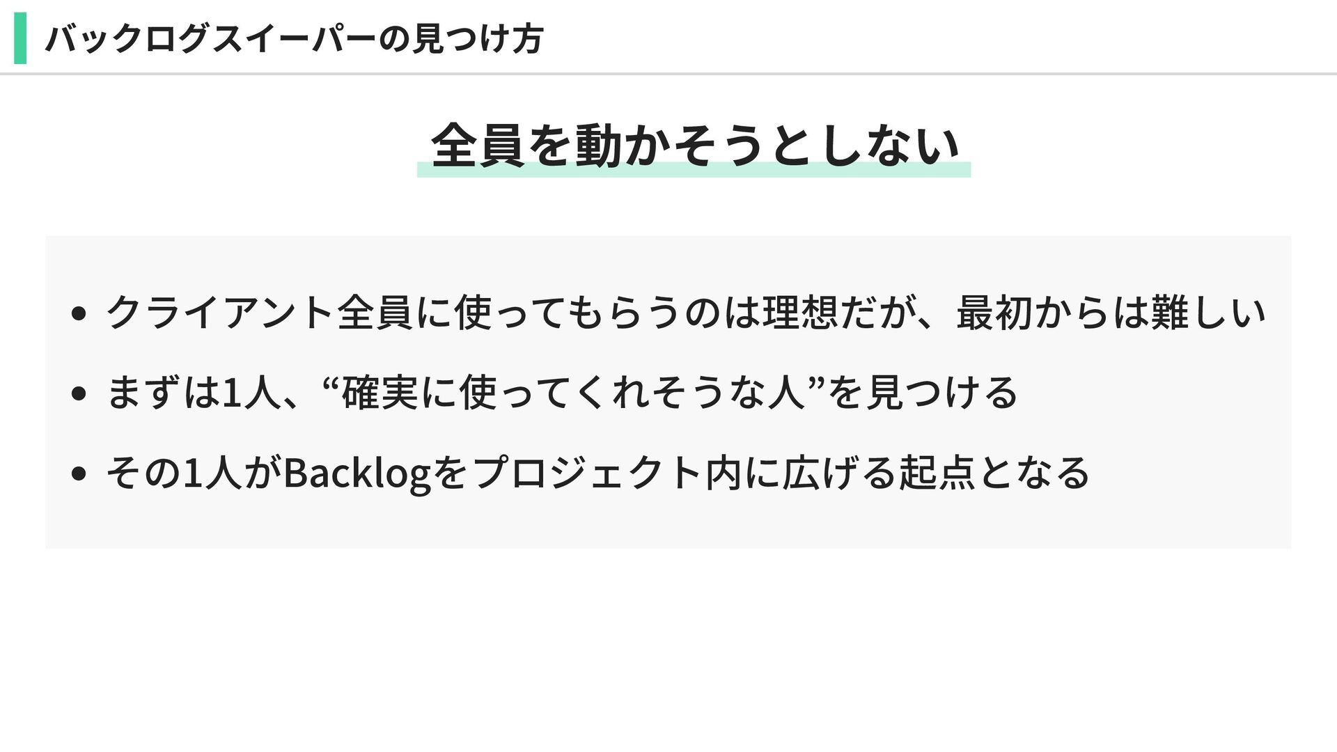 バックログスイーパーの見つけ方 全員を動かそうとしない クライアント全員に使ってもらうのは理想だが、最初からは難しい まずは1人、“確実に使ってくれそうな人”を見つける その1人がBacklogをプロジェクト内に広げる起点となる