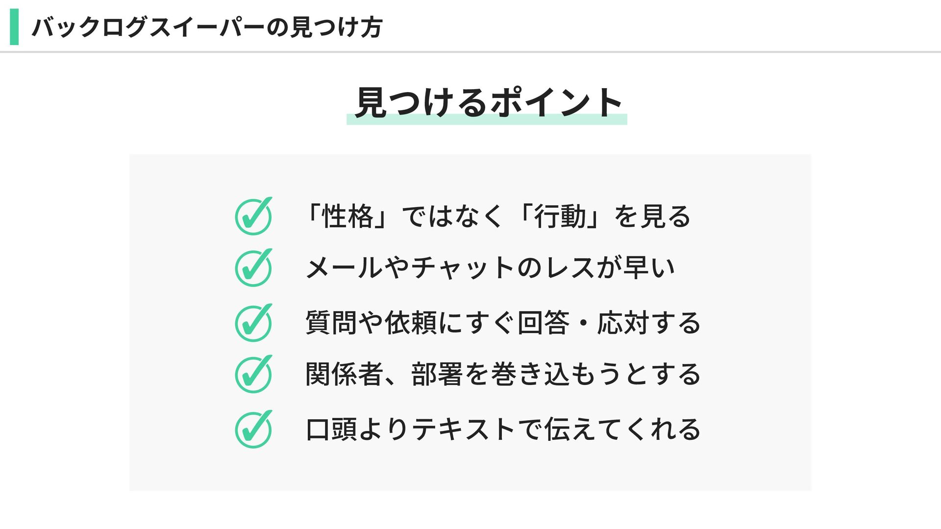見つけるポイント 「性格」ではなく「行動」を見る メールやチャットのレスが早い 質問や依頼にすぐ回答・応対する バックログスイーパーの見つけ方 関係者、部署を巻き込もうとする 口頭よりテキストで伝えてくれる