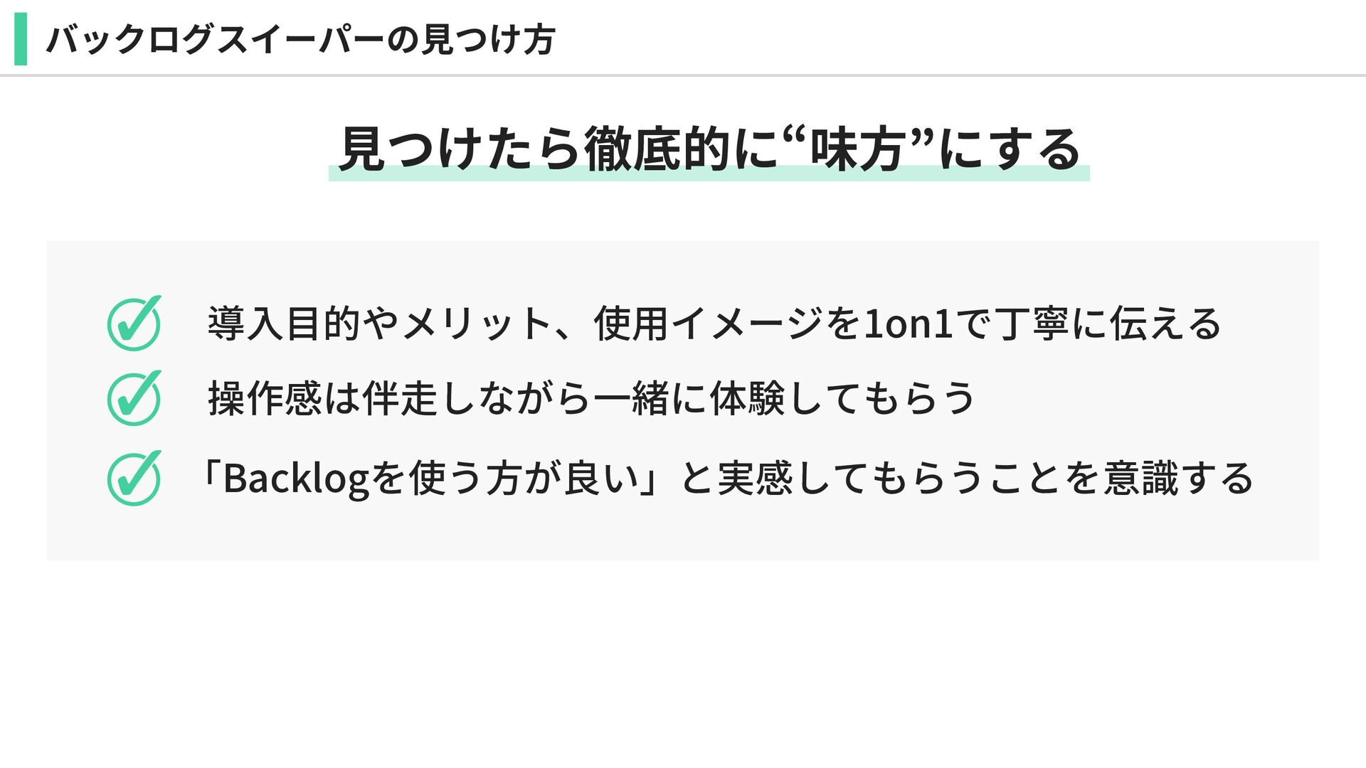 見つけたら徹底的に“味方”にする バックログスイーパーの見つけ方 導入目的やメリット、使用イメージを1on1で丁寧に伝える 操作感は伴走しながら一緒に体験してもらう 「Backlogを使う方が良い」と実感してもらうことを意識する