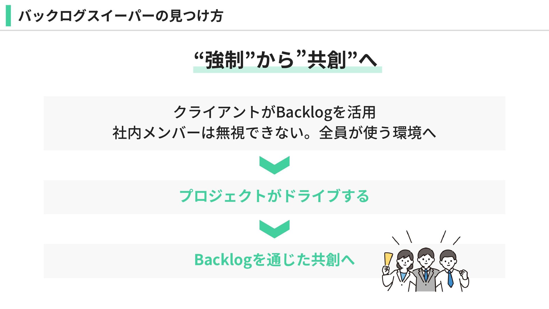 “強制”から”共創”へ バックログスイーパーの見つけ方 クライアントがBacklogを活用 社内メンバーは無視できない。全員が使う環境へ プロジェクトがドライブする Backlogを通じた共創へ