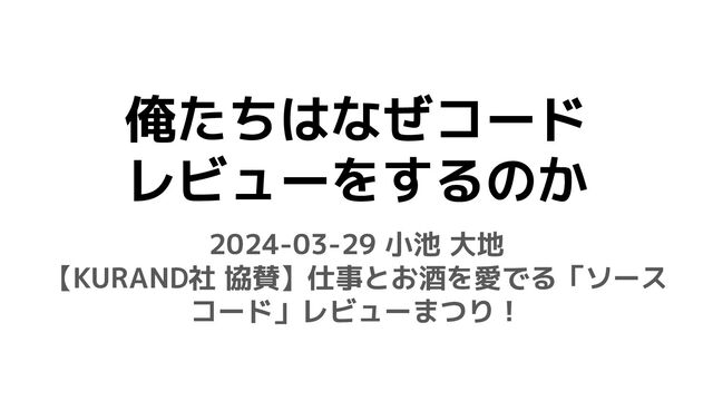 俺たちはなぜコード レビューをするのか 2024-03-29 小池 大地 【KURAND社 協賛】仕事とお酒を愛でる「ソース コード」レビューまつり!