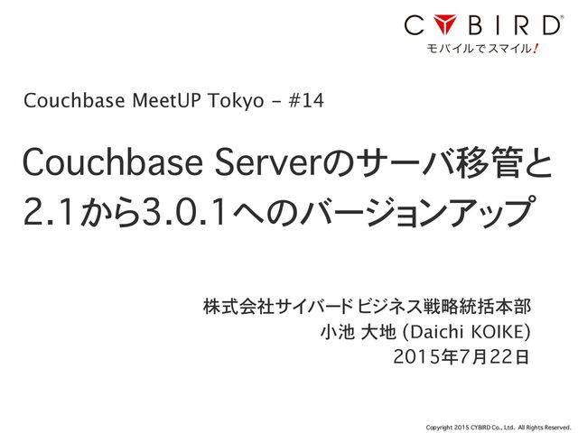2.1から3.0.1へのバージョンアップ 株式会社サイバード ビジネス戦略統括本部 小池 大地 (Daichi KOIKE) 2015年7月22日 1 Couchbase MeetUP Tokyo - #14
