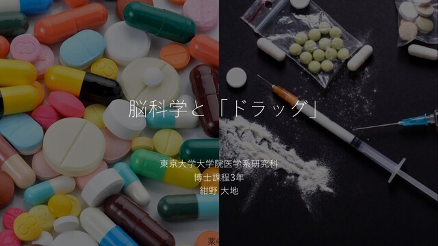 薬の写真を背景に 脳科学と「ドラッグ」 東京⼤学⼤学院医学系研究科 博⼠課程3年 紺野 ⼤地