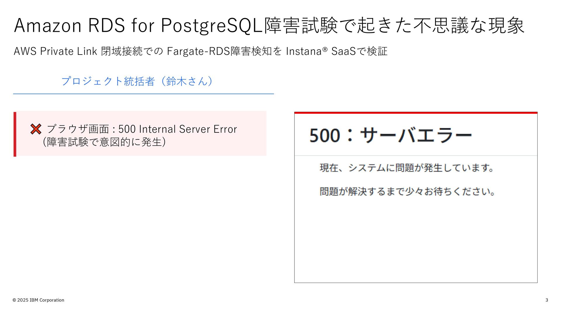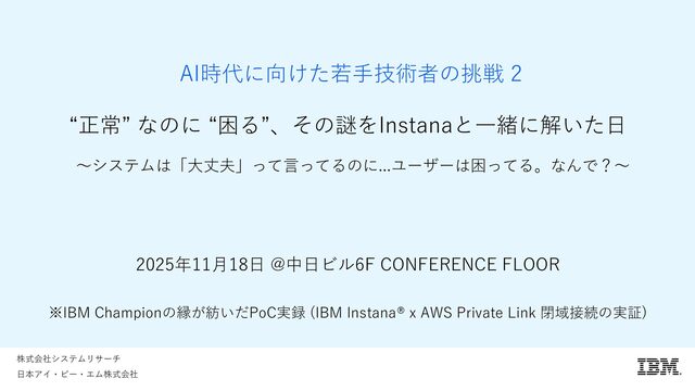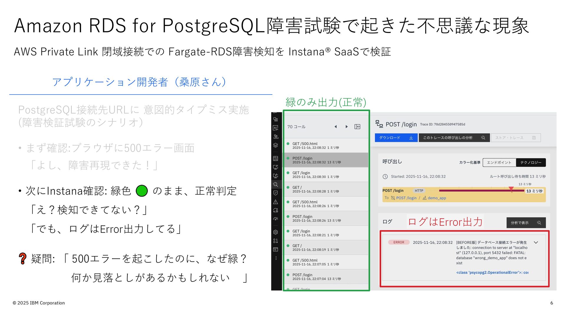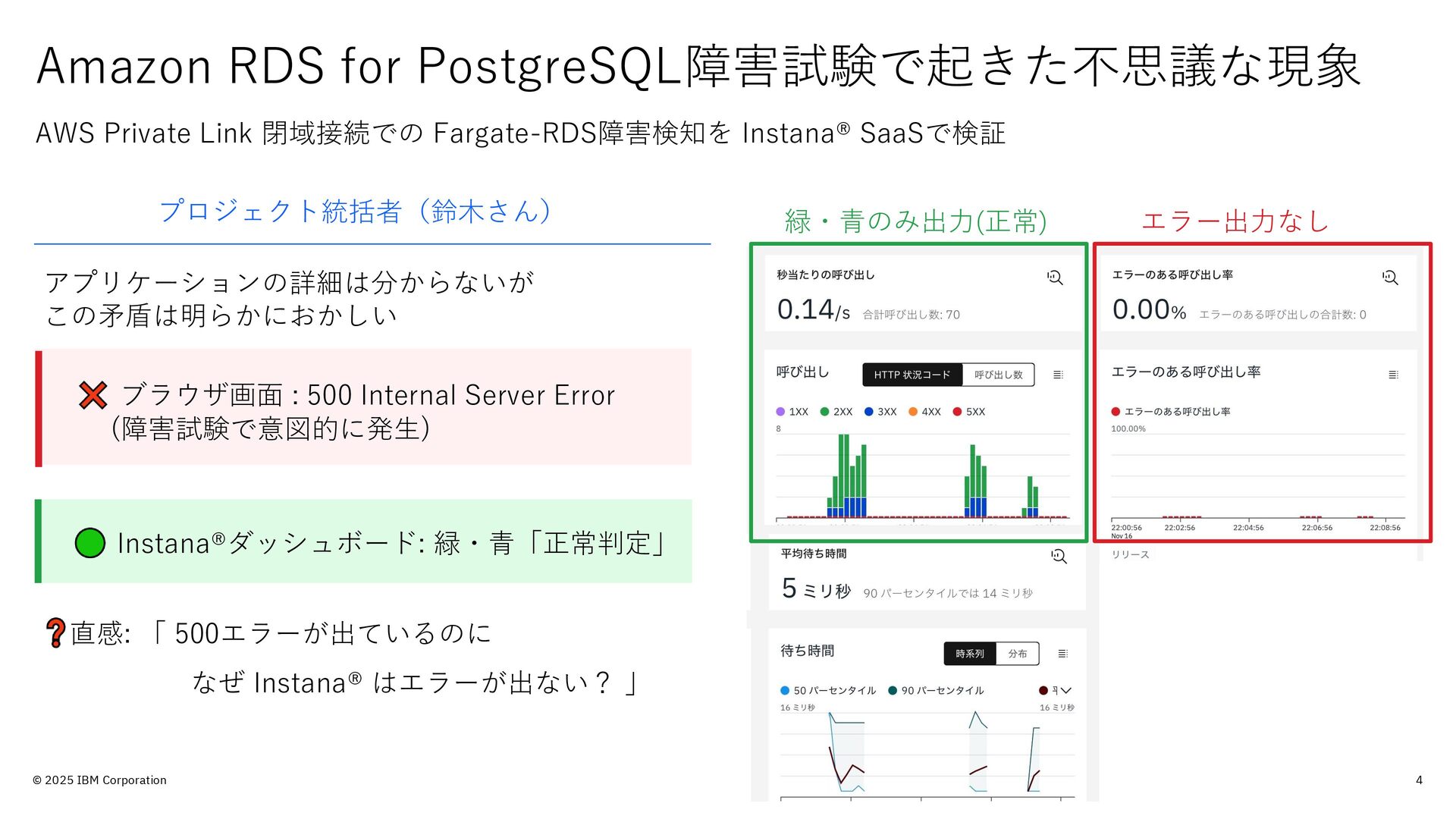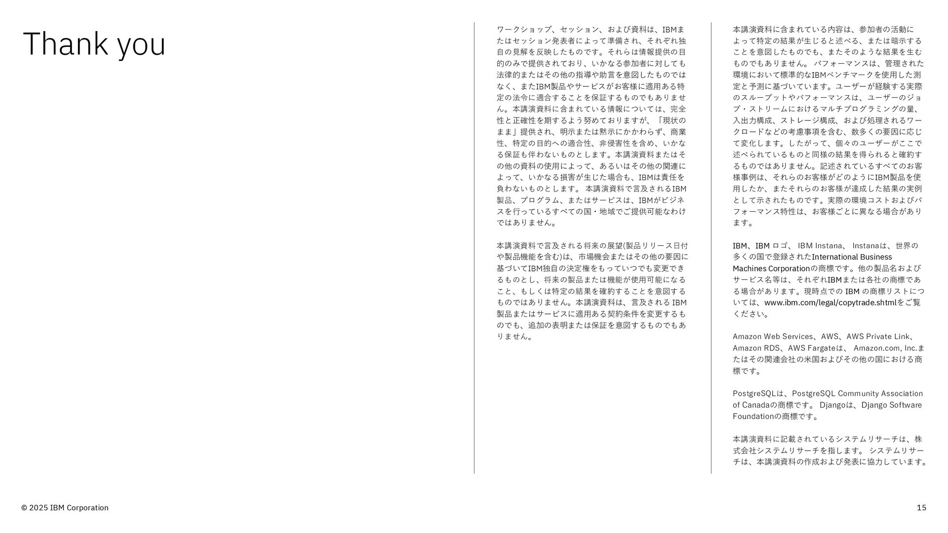 的のみで提供されており、いかなる参加者に対しても 法律的またはその他の指導や助言を意図したものでは なく、またIBM製品やサービスがお客様に適用ある特 定の法令に適合することを保証するものでもありませ ん。本講演資料に含まれている情報については、完全 性と正確性を期するよう努めておりますが、「現状の まま」提供され、明示または黙示にかかわらず、商業 性、特定の目的への適合性、非侵害性を含め、いかな る保証も伴わないものとします。本講演資料またはそ の他の資料の使用によって、あるいはその他の関連に よって、いかなる損害が生じた場合も、IBMは責任を 負わないものとします。 本講演資料で言及されるIBM 製品、プログラム、またはサービスは、IBMがビジネ スを行っているすべての国・地域でご提供可能なわけ ではありません。 本講演資料で言及される将来の展望(製品リリース日付 や製品機能を含む)は、市場機会またはその他の要因に 基づいてIBM独自の決定権をもっていつでも変更でき るものとし、将来の製品または機能が使用可能になる こと、もしくは特定の結果を確約することを意図する ものではありません。本講演資料は、言及される IBM 製品またはサービスに適用ある契約条件を変更するも のでも、追加の表明または保証を意図するものでもあ りません。 本講演資料に含まれている内容は、参加者の活動に よって特定の結果が生じると述べる、または暗示する ことを意図したものでも、またそのような結果を生む ものでもありません。 パフォーマンスは、管理された 環境において標準的なIBMベンチマークを使用した測 定と予測に基づいています。ユーザーが経験する実際 のスループットやパフォーマンスは、ユーザーのジョ ブ・ストリームにおけるマルチプログラミングの量、 入出力構成、ストレージ構成、および処理されるワー クロードなどの考慮事項を含む、数多くの要因に応じ て変化します。したがって、個々のユーザーがここで 述べられているものと同様の結果を得られると確約す るものではありません。記述されているすべてのお客 様事例は、それらのお客様がどのようにIBM製品を使 用したか、またそれらのお客様が達成した結果の実例 として示されたものです。実際の環境コストおよびパ フォーマンス特性は、お客様ごとに異なる場合があり ます。 IBM、IBM ロゴ、 IBM Instana、 Instanaは、世界の 多くの国で登録されたInternational Business Machines Corporationの商標です。他の製品名および サービス名等は、それぞれIBMまたは各社の商標であ る場合があります。現時点での IBM の商標リストにつ いては、www.ibm.com/legal/copytrade.shtmlをご覧 ください。 Amazon Web Services、AWS、AWS Private Link、 Amazon RDS、AWS Fargateは、 Amazon.com, Inc.ま たはその関連会社の米国およびその他の国における商 標です。 PostgreSQLは、PostgreSQL Community Association of Canadaの商標です。 Djangoは、Django Software Foundationの商標です。 本講演資料に記載されているシステムリサーチは、株 式会社システムリサーチを指します。 システムリサー チは、本講演資料の作成および発表に協力しています。