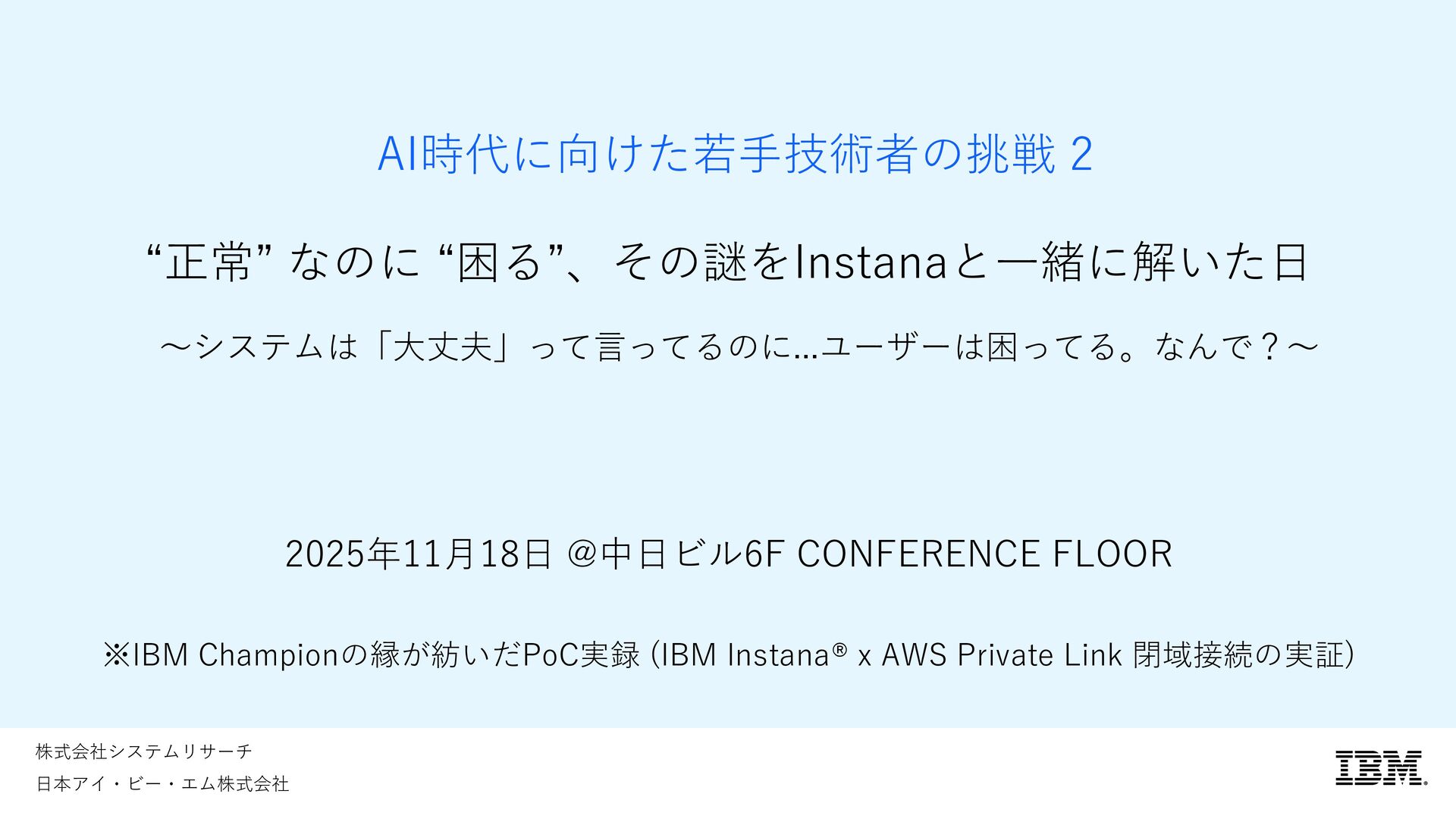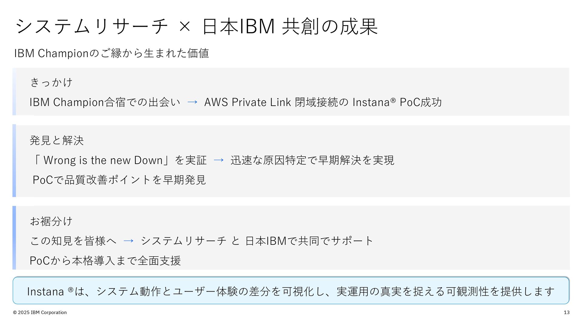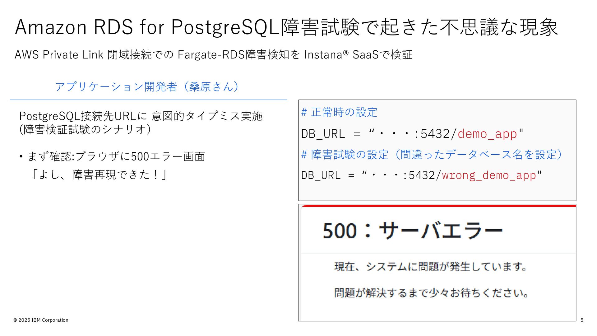 的のみで提供されており、いかなる参加者に対しても 法律的またはその他の指導や助言を意図したものでは なく、またIBM製品やサービスがお客様に適用ある特 定の法令に適合することを保証するものでもありませ ん。本講演資料に含まれている情報については、完全 性と正確性を期するよう努めておりますが、「現状の まま」提供され、明示または黙示にかかわらず、商業 性、特定の目的への適合性、非侵害性を含め、いかな る保証も伴わないものとします。本講演資料またはそ の他の資料の使用によって、あるいはその他の関連に よって、いかなる損害が生じた場合も、IBMは責任を 負わないものとします。 本講演資料で言及されるIBM 製品、プログラム、またはサービスは、IBMがビジネ スを行っているすべての国・地域でご提供可能なわけ ではありません。 本講演資料で言及される将来の展望(製品リリース日付 や製品機能を含む)は、市場機会またはその他の要因に 基づいてIBM独自の決定権をもっていつでも変更でき るものとし、将来の製品または機能が使用可能になる こと、もしくは特定の結果を確約することを意図する ものではありません。本講演資料は、言及される IBM 製品またはサービスに適用ある契約条件を変更するも のでも、追加の表明または保証を意図するものでもあ りません。 本講演資料に含まれている内容は、参加者の活動に よって特定の結果が生じると述べる、または暗示する ことを意図したものでも、またそのような結果を生む ものでもありません。 パフォーマンスは、管理された 環境において標準的なIBMベンチマークを使用した測 定と予測に基づいています。ユーザーが経験する実際 のスループットやパフォーマンスは、ユーザーのジョ ブ・ストリームにおけるマルチプログラミングの量、 入出力構成、ストレージ構成、および処理されるワー クロードなどの考慮事項を含む、数多くの要因に応じ て変化します。したがって、個々のユーザーがここで 述べられているものと同様の結果を得られると確約す るものではありません。記述されているすべてのお客 様事例は、それらのお客様がどのようにIBM製品を使 用したか、またそれらのお客様が達成した結果の実例 として示されたものです。実際の環境コストおよびパ フォーマンス特性は、お客様ごとに異なる場合があり ます。 IBM、IBM ロゴ、 IBM Instana、 Instanaは、世界の 多くの国で登録されたInternational Business Machines Corporationの商標です。他の製品名および サービス名等は、それぞれIBMまたは各社の商標であ る場合があります。現時点での IBM の商標リストにつ いては、www.ibm.com/legal/copytrade.shtmlをご覧 ください。 Amazon Web Services、AWS、AWS Private Link、 Amazon RDS、AWS Fargateは、 Amazon.com, Inc.ま たはその関連会社の米国およびその他の国における商 標です。 PostgreSQLは、PostgreSQL Community Association of Canadaの商標です。 Djangoは、Django Software Foundationの商標です。 本講演資料に記載されているシステムリサーチは、株 式会社システムリサーチを指します。 システムリサー チは、本講演資料の作成および発表に協力しています。