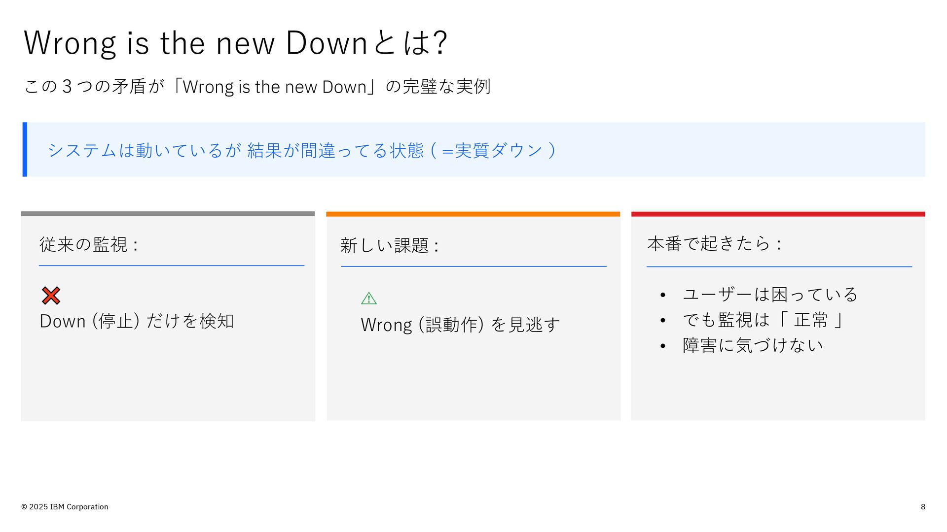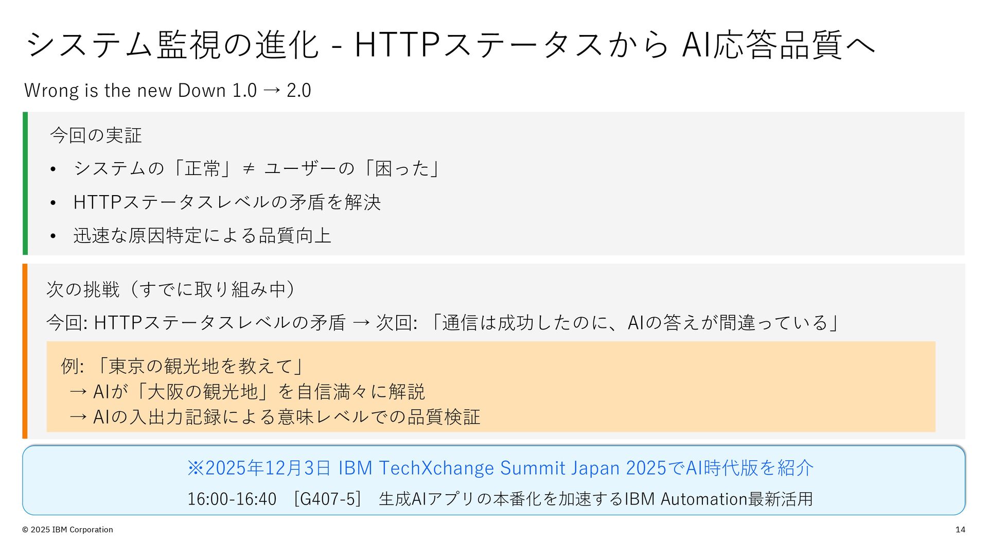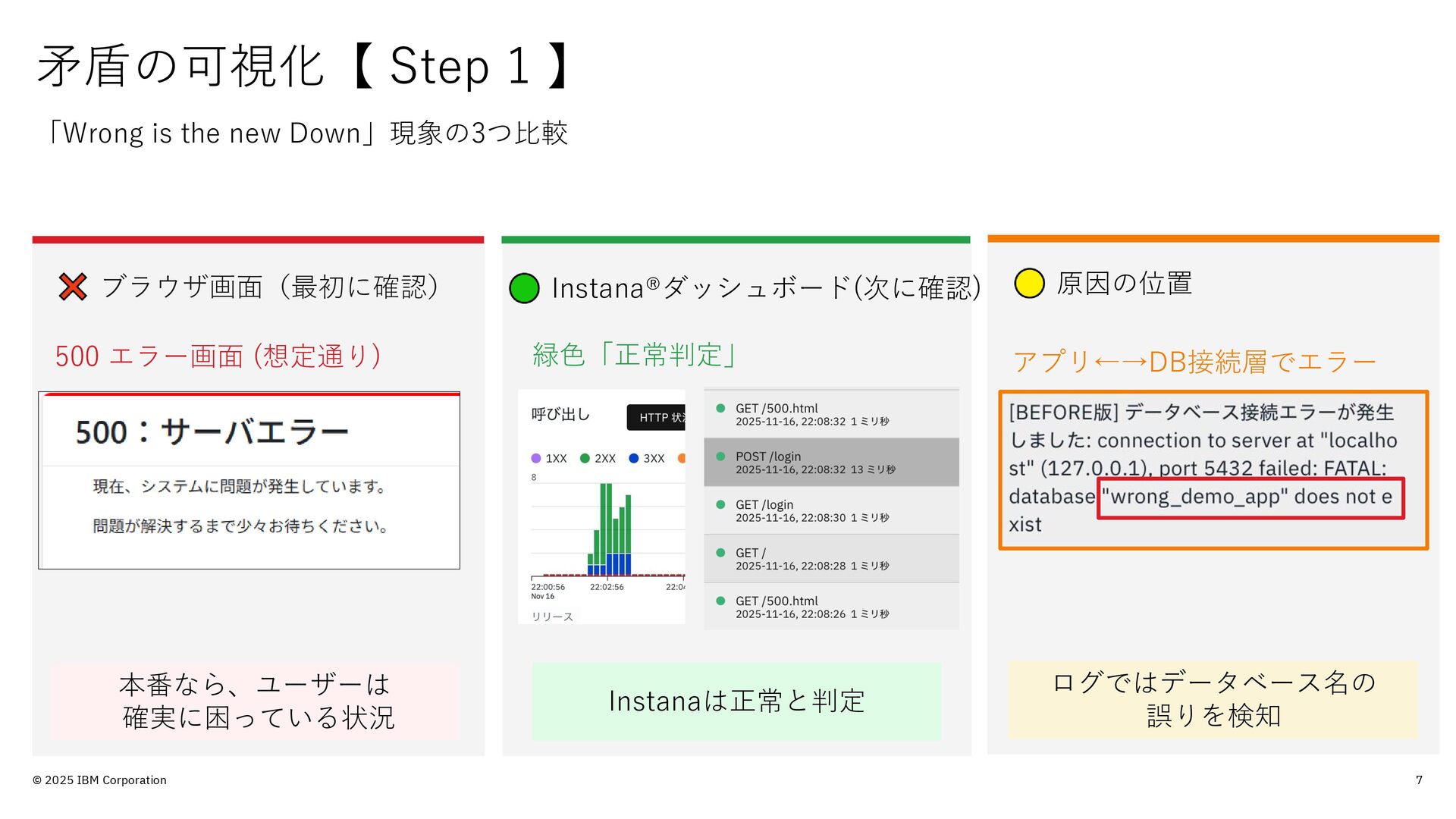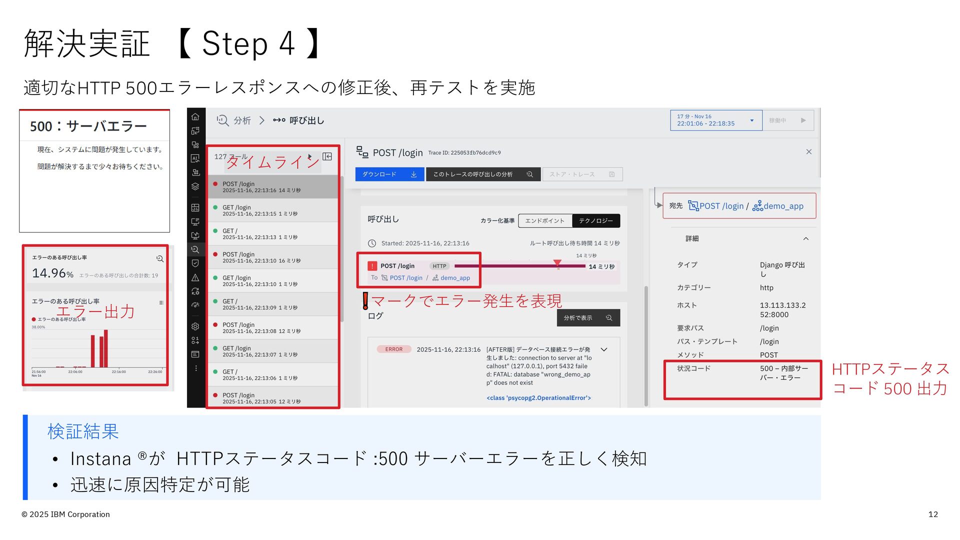 的のみで提供されており、いかなる参加者に対しても 法律的またはその他の指導や助言を意図したものでは なく、またIBM製品やサービスがお客様に適用ある特 定の法令に適合することを保証するものでもありませ ん。本講演資料に含まれている情報については、完全 性と正確性を期するよう努めておりますが、「現状の まま」提供され、明示または黙示にかかわらず、商業 性、特定の目的への適合性、非侵害性を含め、いかな る保証も伴わないものとします。本講演資料またはそ の他の資料の使用によって、あるいはその他の関連に よって、いかなる損害が生じた場合も、IBMは責任を 負わないものとします。 本講演資料で言及されるIBM 製品、プログラム、またはサービスは、IBMがビジネ スを行っているすべての国・地域でご提供可能なわけ ではありません。 本講演資料で言及される将来の展望(製品リリース日付 や製品機能を含む)は、市場機会またはその他の要因に 基づいてIBM独自の決定権をもっていつでも変更でき るものとし、将来の製品または機能が使用可能になる こと、もしくは特定の結果を確約することを意図する ものではありません。本講演資料は、言及される IBM 製品またはサービスに適用ある契約条件を変更するも のでも、追加の表明または保証を意図するものでもあ りません。 本講演資料に含まれている内容は、参加者の活動に よって特定の結果が生じると述べる、または暗示する ことを意図したものでも、またそのような結果を生む ものでもありません。 パフォーマンスは、管理された 環境において標準的なIBMベンチマークを使用した測 定と予測に基づいています。ユーザーが経験する実際 のスループットやパフォーマンスは、ユーザーのジョ ブ・ストリームにおけるマルチプログラミングの量、 入出力構成、ストレージ構成、および処理されるワー クロードなどの考慮事項を含む、数多くの要因に応じ て変化します。したがって、個々のユーザーがここで 述べられているものと同様の結果を得られると確約す るものではありません。記述されているすべてのお客 様事例は、それらのお客様がどのようにIBM製品を使 用したか、またそれらのお客様が達成した結果の実例 として示されたものです。実際の環境コストおよびパ フォーマンス特性は、お客様ごとに異なる場合があり ます。 IBM、IBM ロゴ、 IBM Instana、 Instanaは、世界の 多くの国で登録されたInternational Business Machines Corporationの商標です。他の製品名および サービス名等は、それぞれIBMまたは各社の商標であ る場合があります。現時点での IBM の商標リストにつ いては、www.ibm.com/legal/copytrade.shtmlをご覧 ください。 Amazon Web Services、AWS、AWS Private Link、 Amazon RDS、AWS Fargateは、 Amazon.com, Inc.ま たはその関連会社の米国およびその他の国における商 標です。 PostgreSQLは、PostgreSQL Community Association of Canadaの商標です。 Djangoは、Django Software Foundationの商標です。 本講演資料に記載されているシステムリサーチは、株 式会社システムリサーチを指します。 システムリサー チは、本講演資料の作成および発表に協力しています。