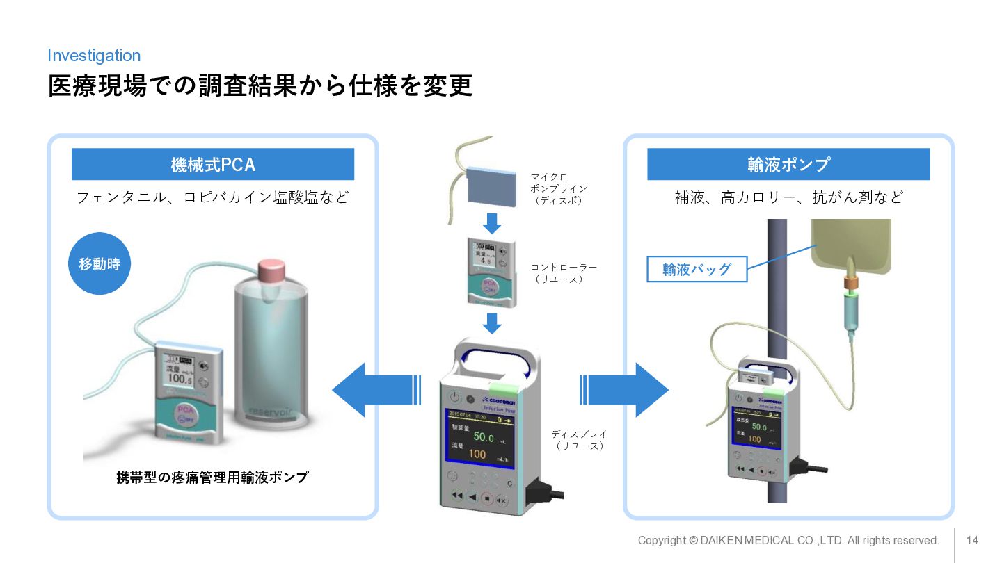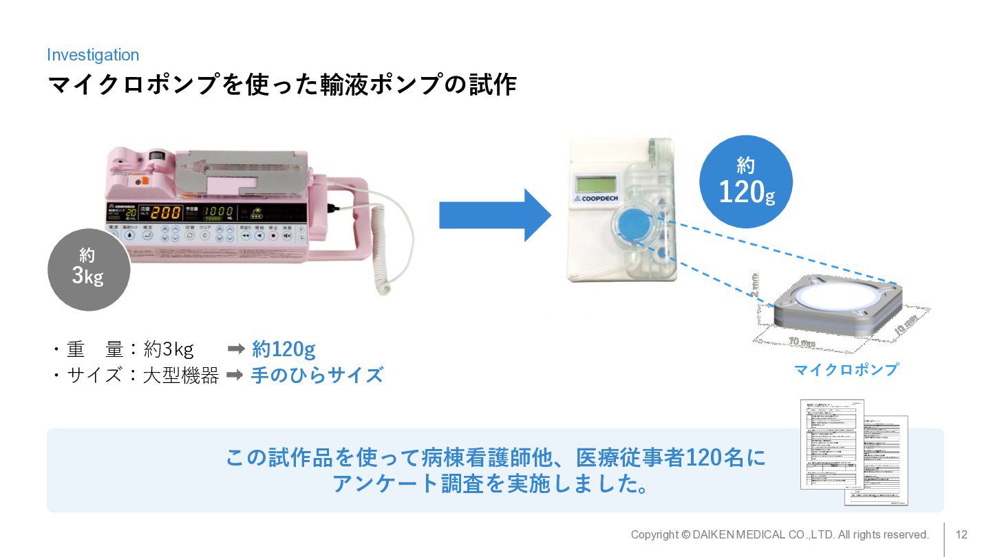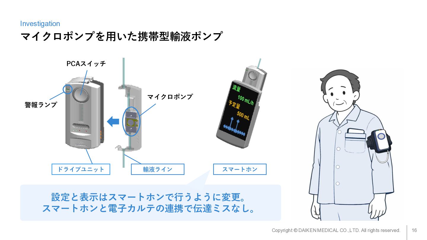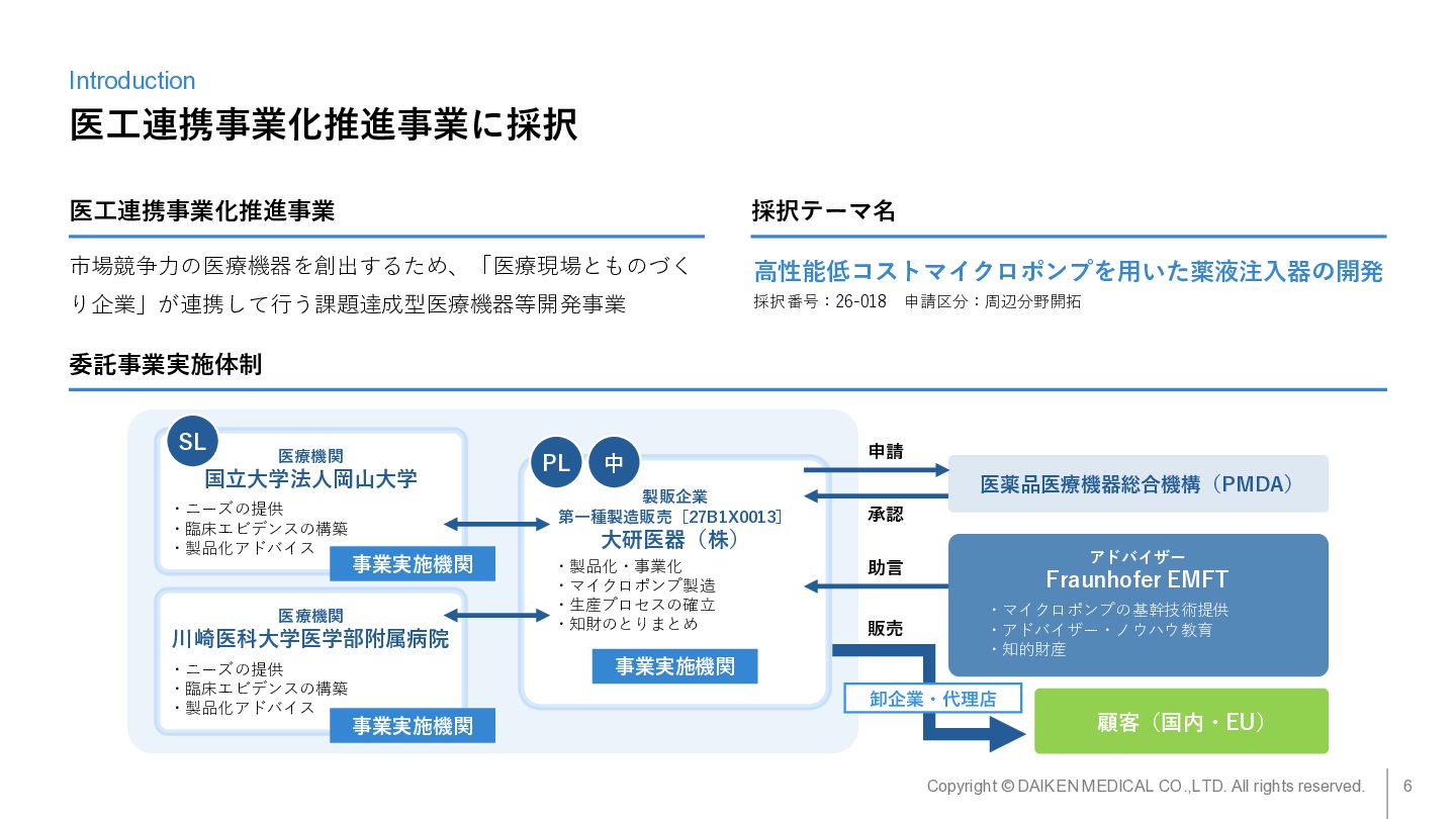 医工連携事業化推進事業 市場競争力の医療機器を創出するため、「医療現場とものづく り企業」が連携して行う課題達成型医療機器等開発事業 高性能低コストマイクロポンプを用いた薬液注入器の開発 採択番号:26-018 申請区分:周辺分野開拓 委託事業実施体制 採択テーマ名 医療機関 川崎医科大学医学部附属病院 ・ニーズの提供 ・臨床エビデンスの構築 ・製品化アドバイス 医療機関 国立大学法人岡山大学 ・ニーズの提供 ・臨床エビデンスの構築 ・製品化アドバイス SL 製販企業 第一種製造販売[27B1X0013] 大研医器(株) ・製品化・事業化 ・マイクロポンプ製造 ・生産プロセスの確立 ・知財のとりまとめ 事業実施機関 事業実施機関 事業実施機関 PL 中 医薬品医療機器総合機構(PMDA) 申請 承認 アドバイザー Fraunhofer EMFT ・マイクロポンプの基幹技術提供 ・アドバイザー・ノウハウ教育 ・知的財産 助言 販売 顧客(国内・EU) 卸企業・代理店 Introduction
