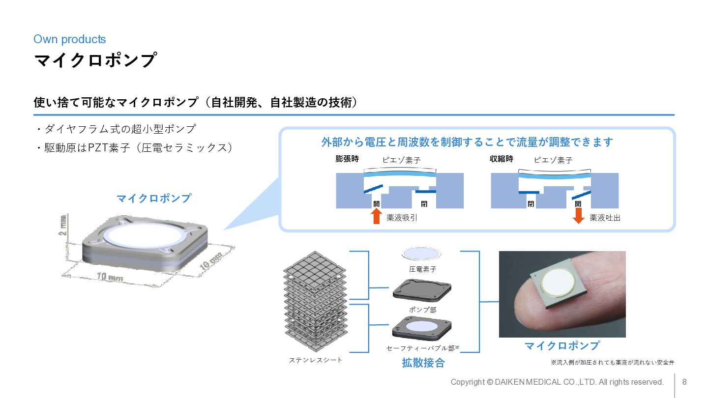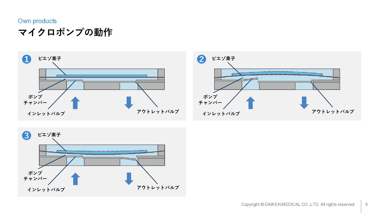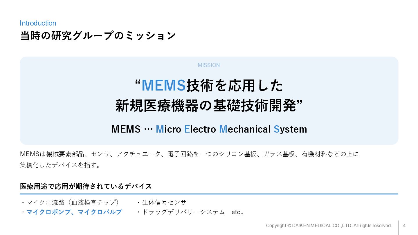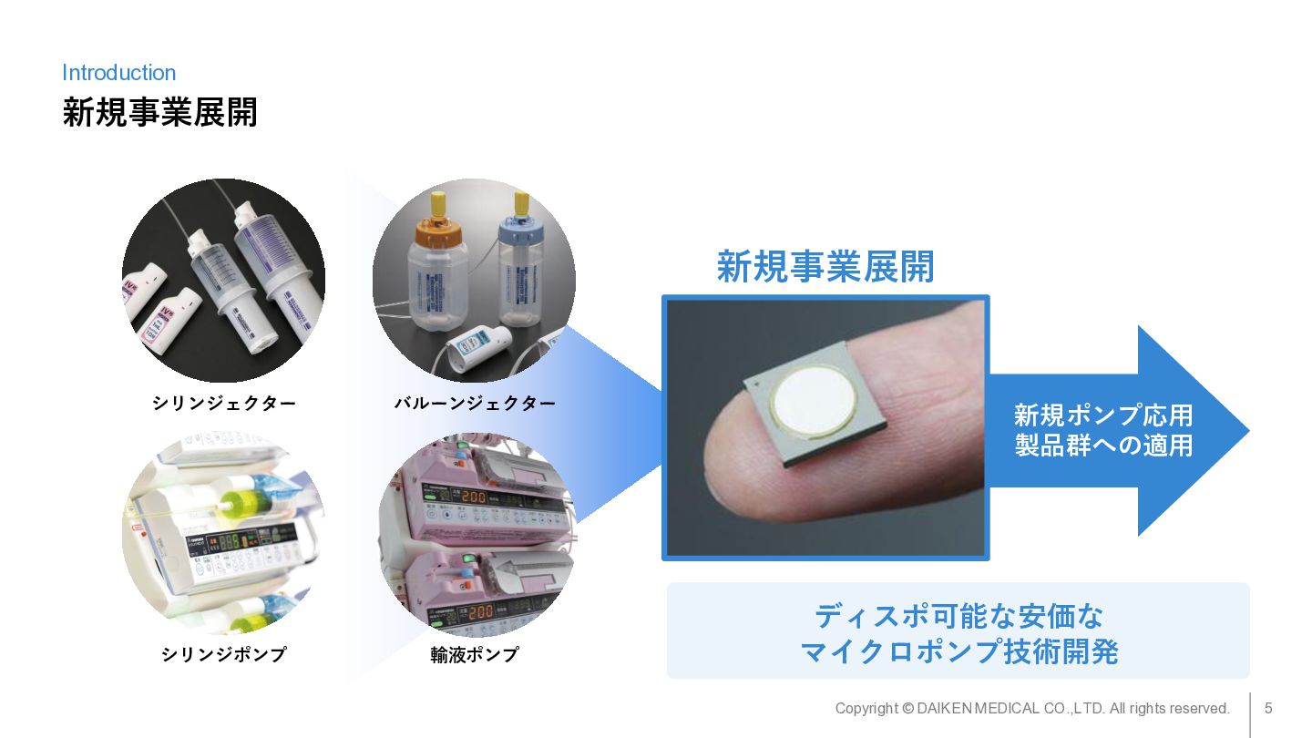 医工連携事業化推進事業 市場競争力の医療機器を創出するため、「医療現場とものづく り企業」が連携して行う課題達成型医療機器等開発事業 高性能低コストマイクロポンプを用いた薬液注入器の開発 採択番号:26-018 申請区分:周辺分野開拓 委託事業実施体制 採択テーマ名 医療機関 川崎医科大学医学部附属病院 ・ニーズの提供 ・臨床エビデンスの構築 ・製品化アドバイス 医療機関 国立大学法人岡山大学 ・ニーズの提供 ・臨床エビデンスの構築 ・製品化アドバイス SL 製販企業 第一種製造販売[27B1X0013] 大研医器(株) ・製品化・事業化 ・マイクロポンプ製造 ・生産プロセスの確立 ・知財のとりまとめ 事業実施機関 事業実施機関 事業実施機関 PL 中 医薬品医療機器総合機構(PMDA) 申請 承認 アドバイザー Fraunhofer EMFT ・マイクロポンプの基幹技術提供 ・アドバイザー・ノウハウ教育 ・知的財産 助言 販売 顧客(国内・EU) 卸企業・代理店 Introduction