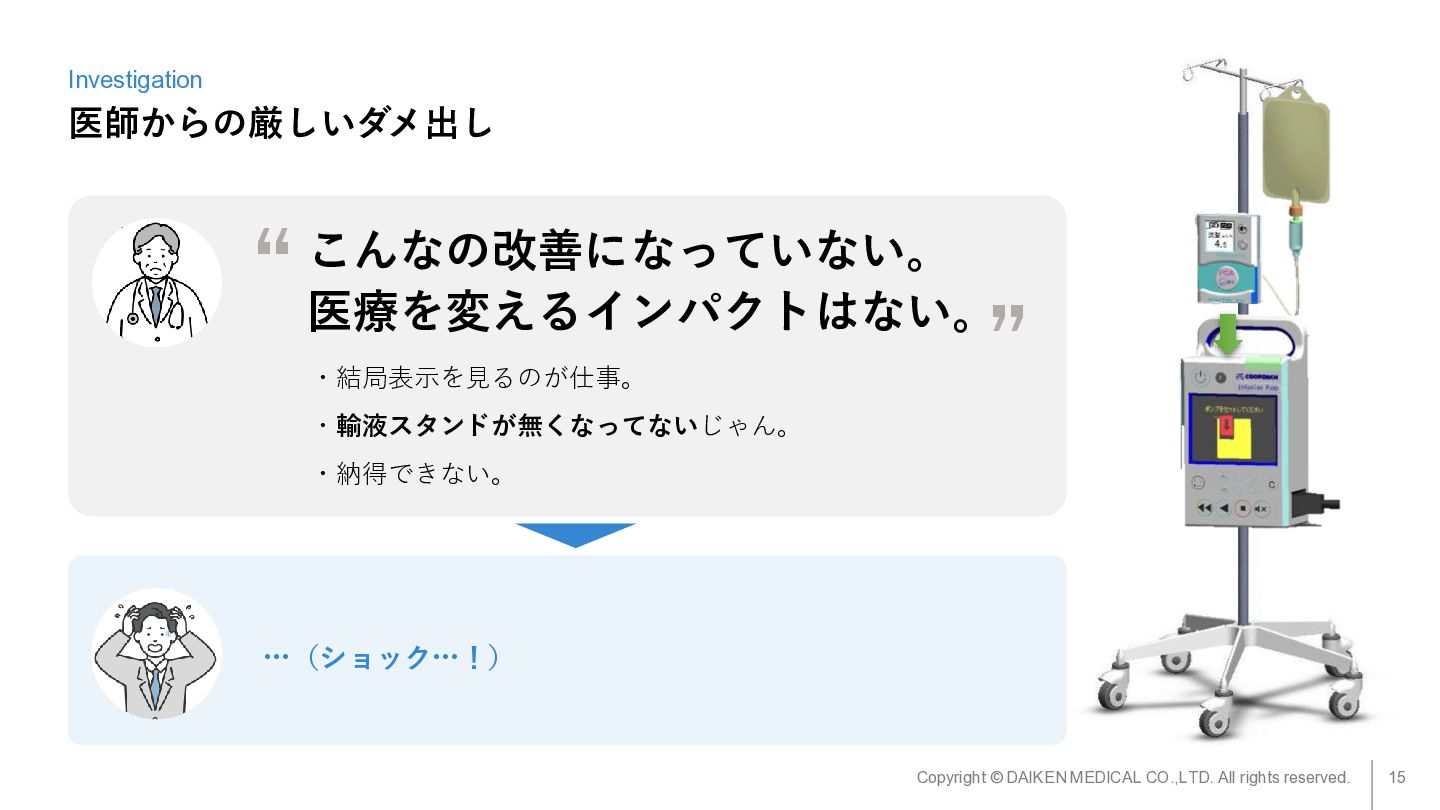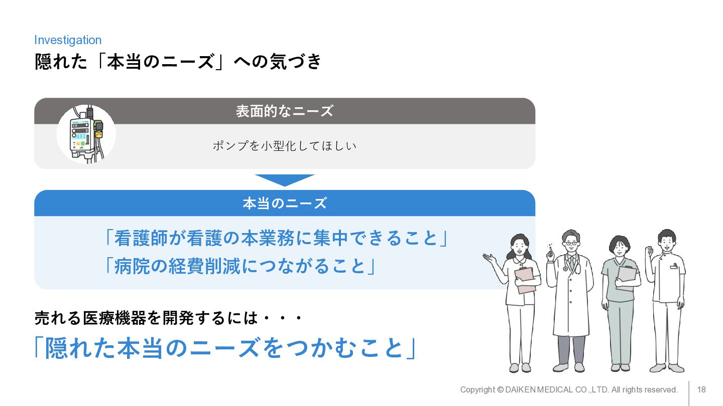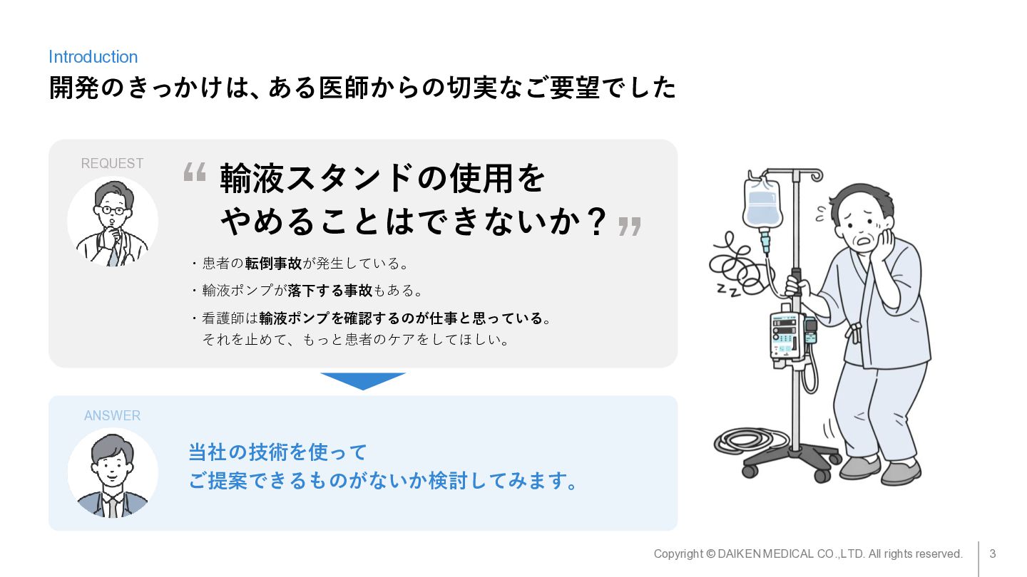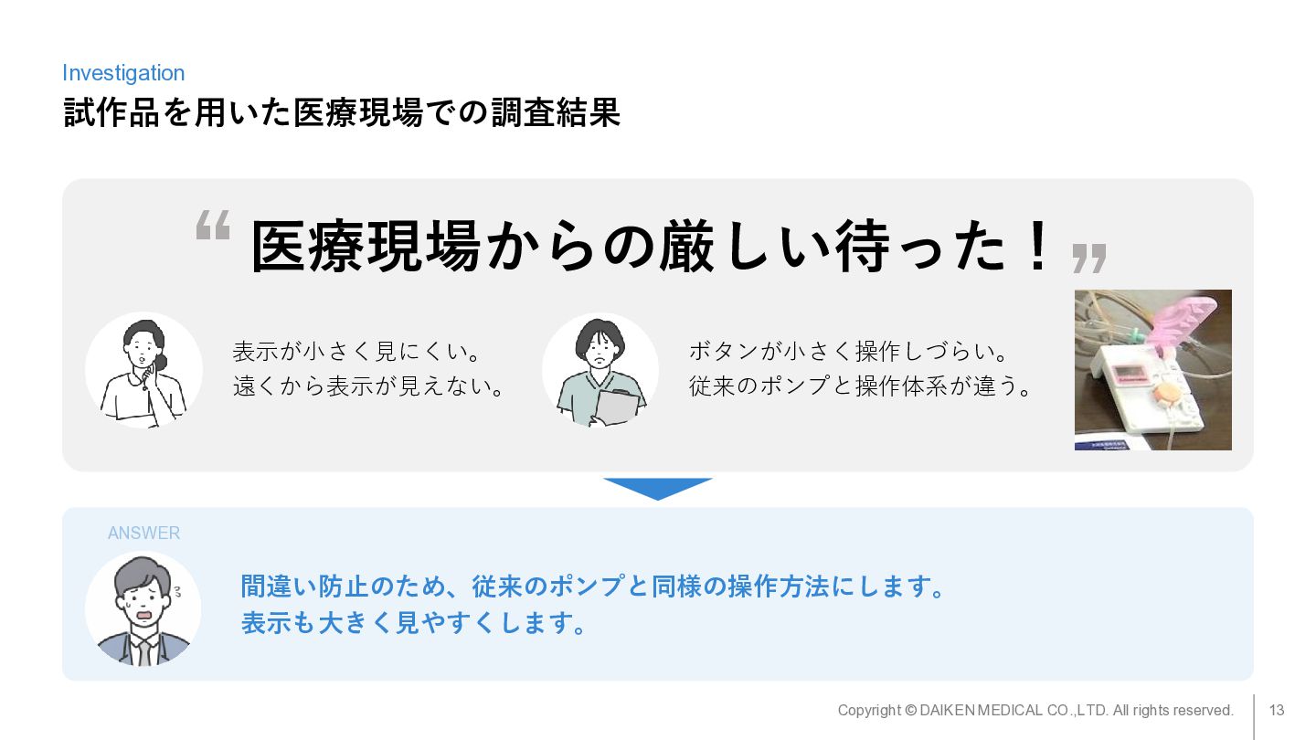 医工連携事業化推進事業 市場競争力の医療機器を創出するため、「医療現場とものづく り企業」が連携して行う課題達成型医療機器等開発事業 高性能低コストマイクロポンプを用いた薬液注入器の開発 採択番号:26-018 申請区分:周辺分野開拓 委託事業実施体制 採択テーマ名 医療機関 川崎医科大学医学部附属病院 ・ニーズの提供 ・臨床エビデンスの構築 ・製品化アドバイス 医療機関 国立大学法人岡山大学 ・ニーズの提供 ・臨床エビデンスの構築 ・製品化アドバイス SL 製販企業 第一種製造販売[27B1X0013] 大研医器(株) ・製品化・事業化 ・マイクロポンプ製造 ・生産プロセスの確立 ・知財のとりまとめ 事業実施機関 事業実施機関 事業実施機関 PL 中 医薬品医療機器総合機構(PMDA) 申請 承認 アドバイザー Fraunhofer EMFT ・マイクロポンプの基幹技術提供 ・アドバイザー・ノウハウ教育 ・知的財産 助言 販売 顧客(国内・EU) 卸企業・代理店 Introduction