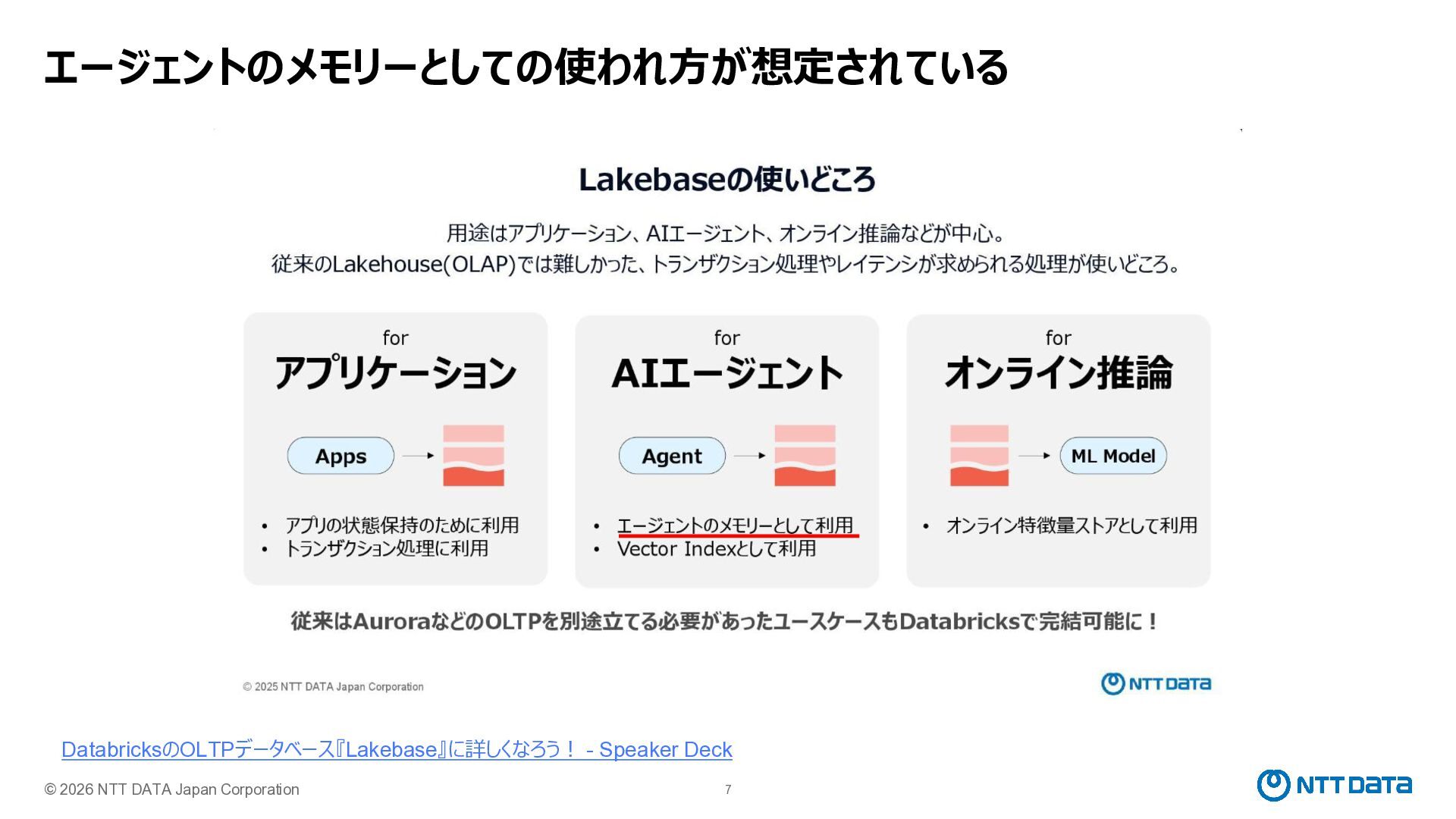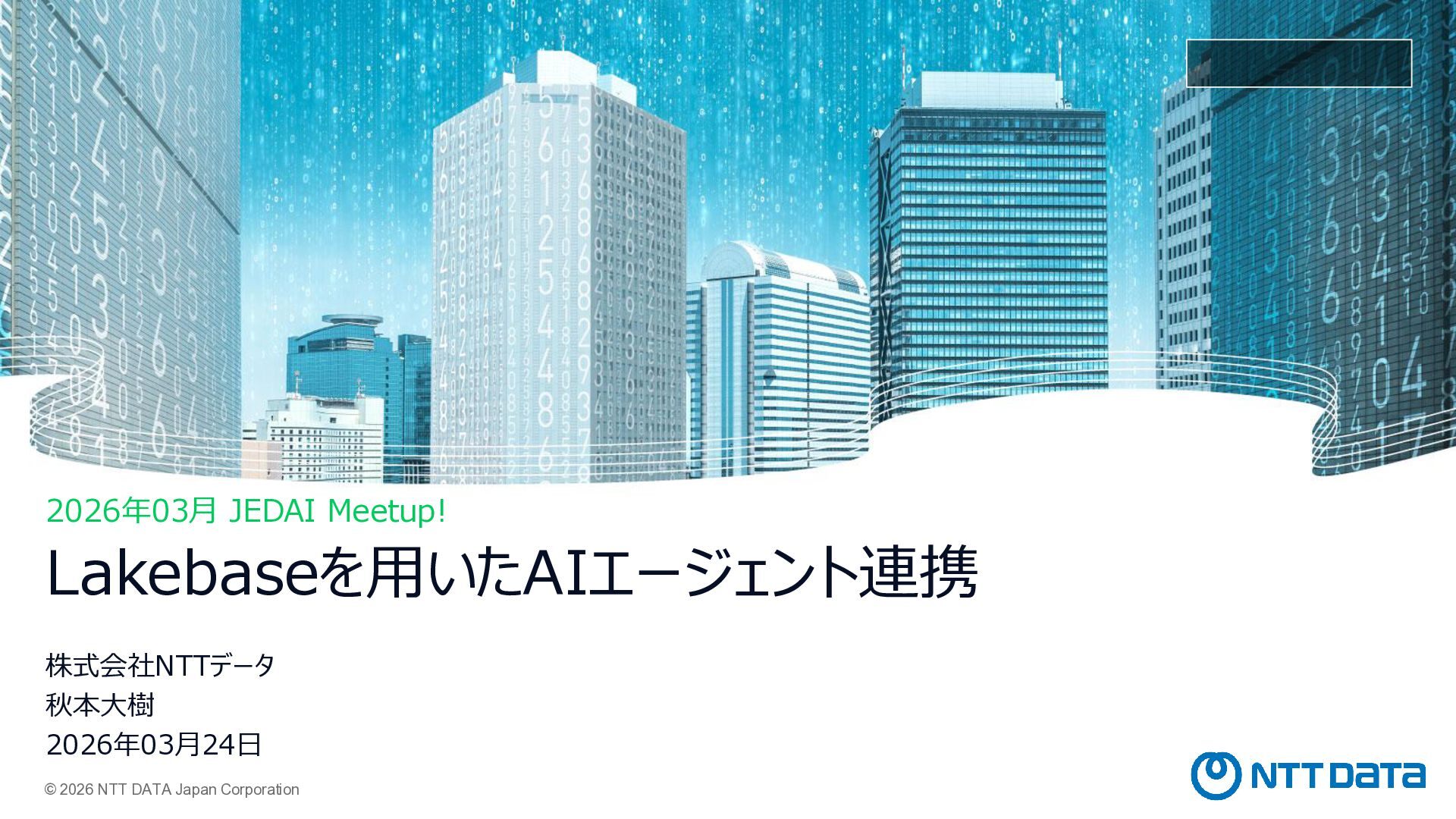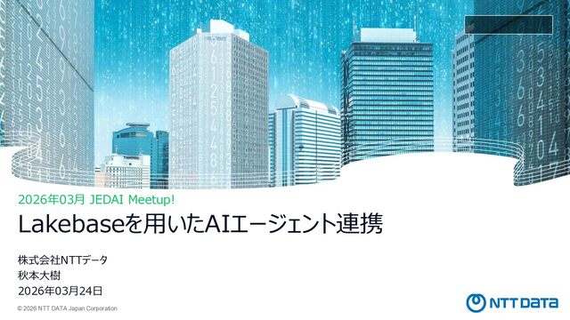 DATA Japan Corporation 2026年03月 JEDAI Meetup! Lakebaseを用いたAIエージェント連携 株式会社NTTデータ 秋本大樹 2026年03月24日