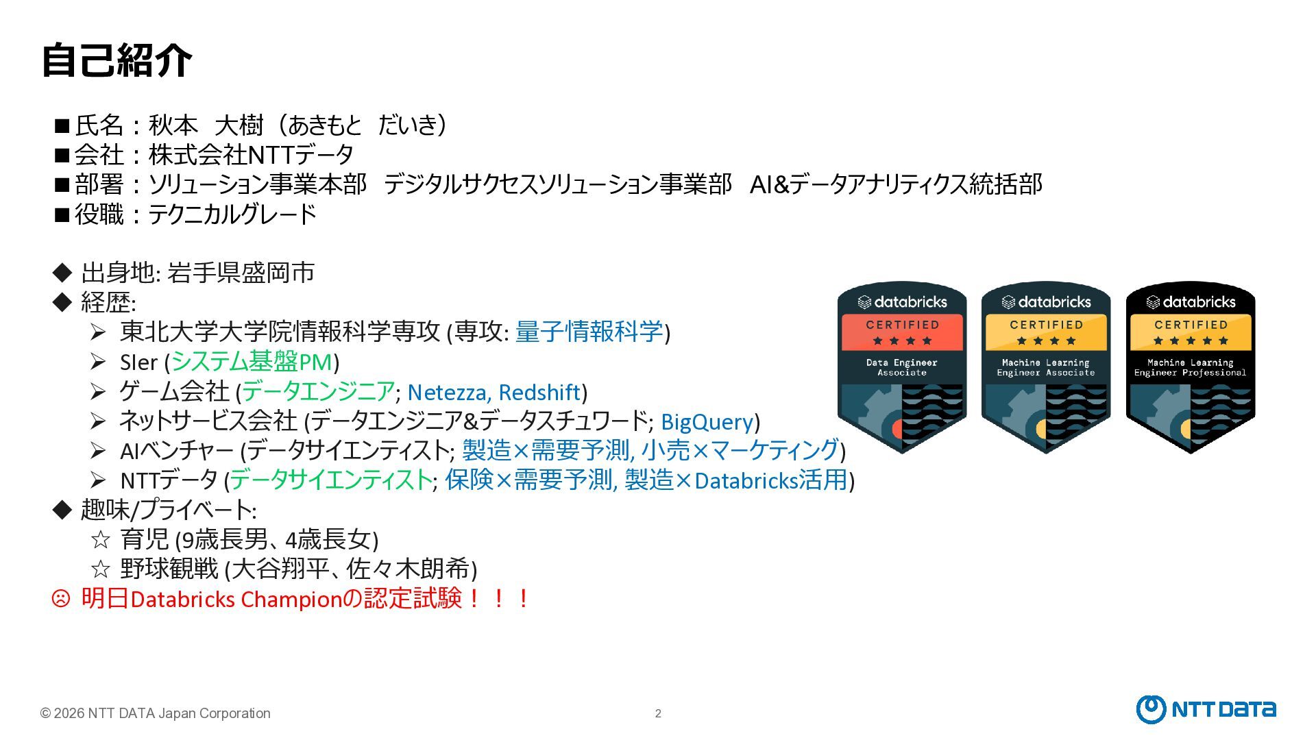 だいき) ▪会社:株式会社NTTデータ ▪部署:ソリューション事業本部 デジタルサクセスソリューション事業部 AI&データアナリティクス統括部 ▪役職:テクニカルグレード ◆ 出身地: 岩手県盛岡市 ◆ 経歴: ➢ 東北大学大学院情報科学専攻 (専攻: 量子情報科学) ➢ SIer (システム基盤PM) ➢ ゲーム会社 (データエンジニア; Netezza, Redshift) ➢ ネットサービス会社 (データエンジニア&データスチュワード; BigQuery) ➢ AIベンチャー (データサイエンティスト; 製造×需要予測, 小売×マーケティング) ➢ NTTデータ (データサイエンティスト; 保険×需要予測, 製造×Databricks活用) ◆ 趣味/プライベート: ☆ 育児 (9歳長男、4歳長女) ☆ 野球観戦 (大谷翔平、佐々木朗希) ☹ 明日Databricks Championの認定試験!!!
