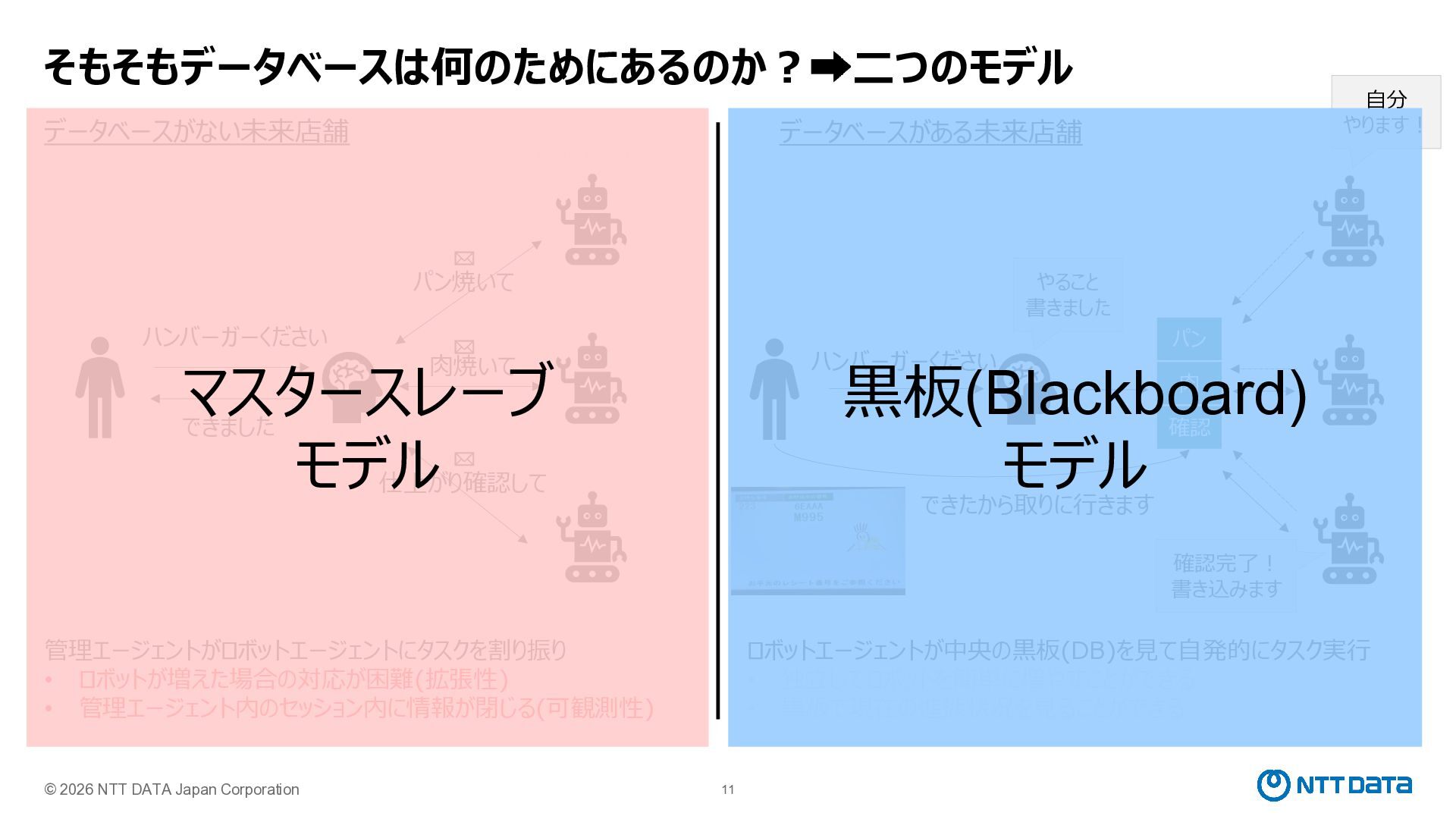 データベースがある未来店舗 ハンバーガーください できました パン焼いて 肉焼いて 仕上がり確認して 管理エージェントがロボットエージェントにタスクを割り振り • ロボットが増えた場合の対応が困難(拡張性) • 管理エージェント内のセッション内に情報が閉じる(可観測性) ロボットエージェント 管理エージェント ハンバーガーください パン 肉 確認 できたから取りに行きます やること 書きました 自分 やります! ロボットエージェントが中央の黒板(DB)を見て自発的にタスク実行 • 独立してロボットを簡単に増やすことができる • 黒板で現在の進捗状況を見ることができる マスタースレーブ モデル 確認完了! 書き込みます 黒板(Blackboard) モデル