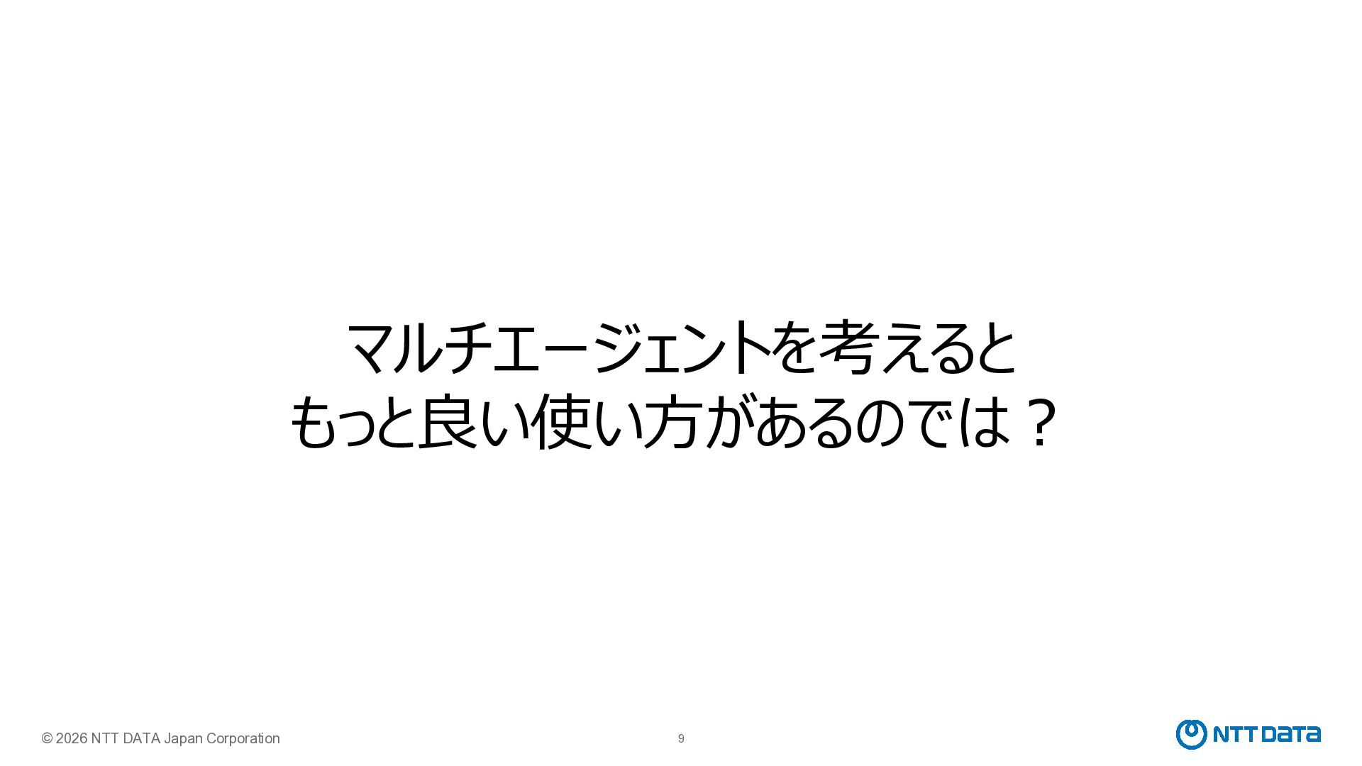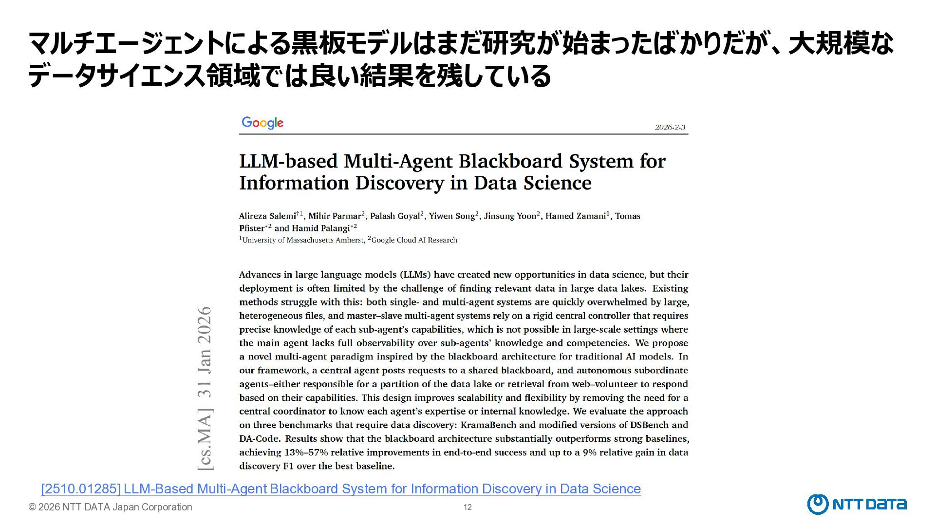 14. © 2026 NTT DATA Japan Corporation 27 まとめと今後の展望 ▍マルチエージェントシステムにおける黒板モデル 今後フィジカルAIなどの単一タスクをこなすエージェントを大量に制御する必要がある場合、従来の中央集権的なマスタースレーブ