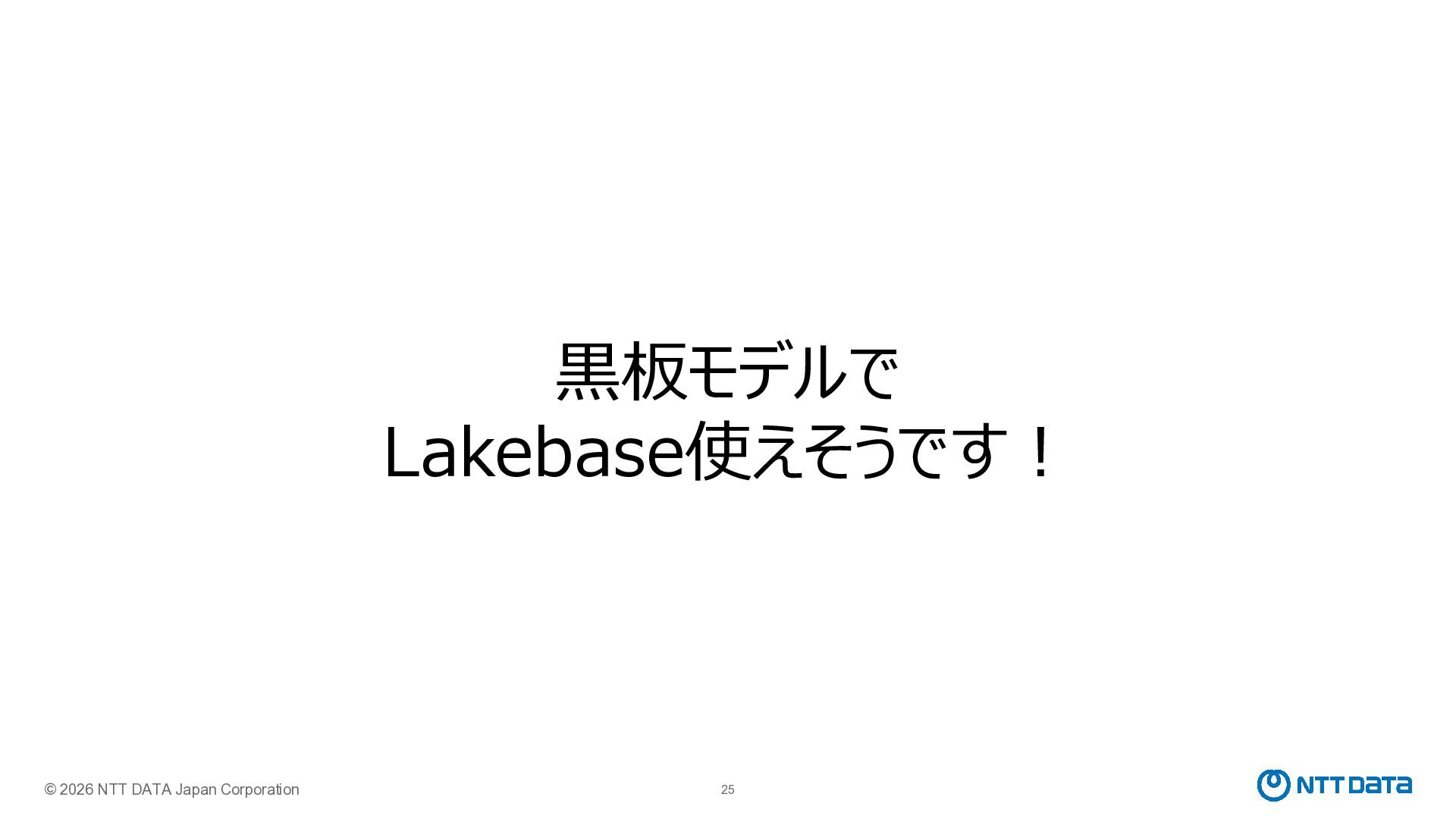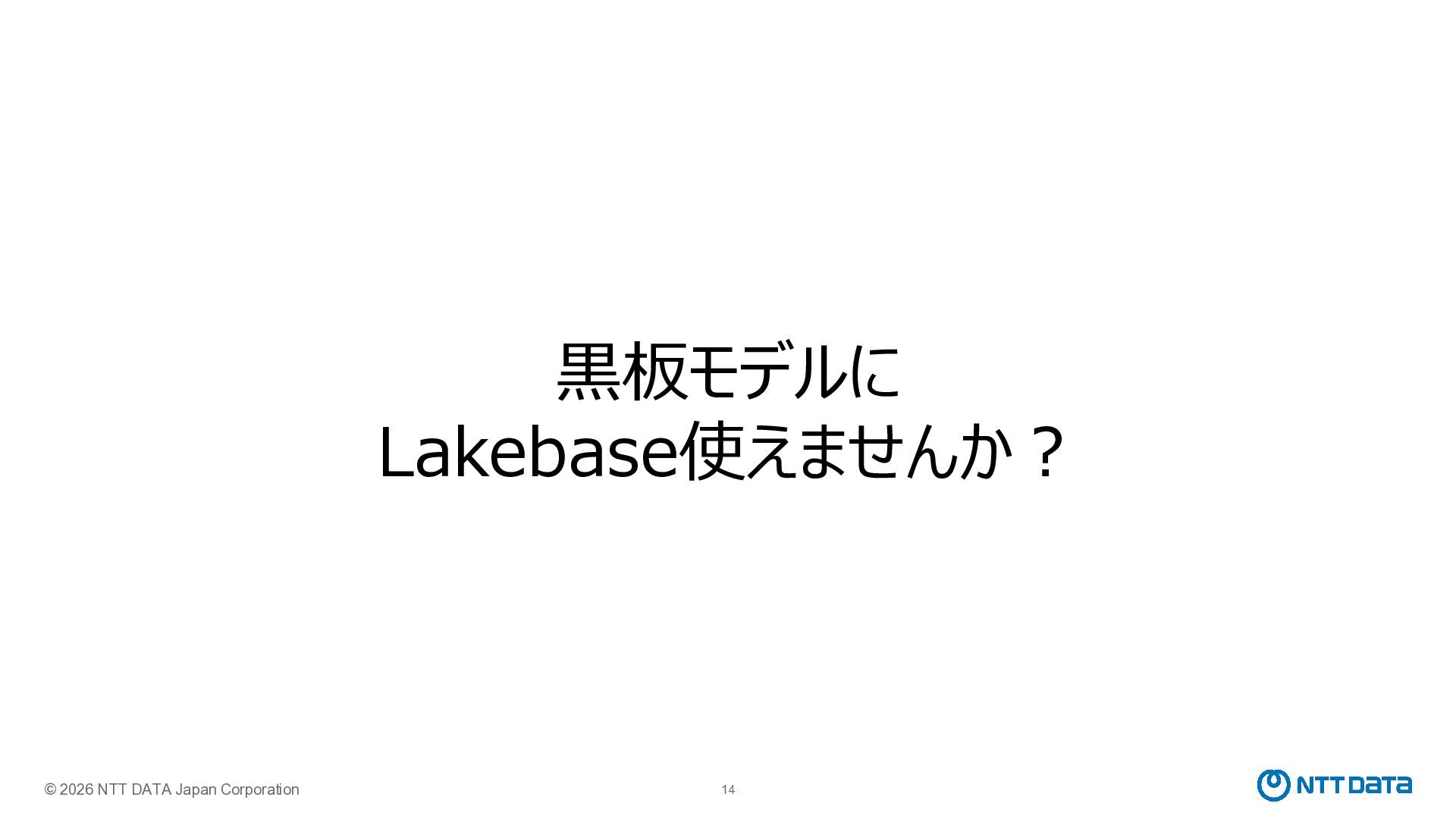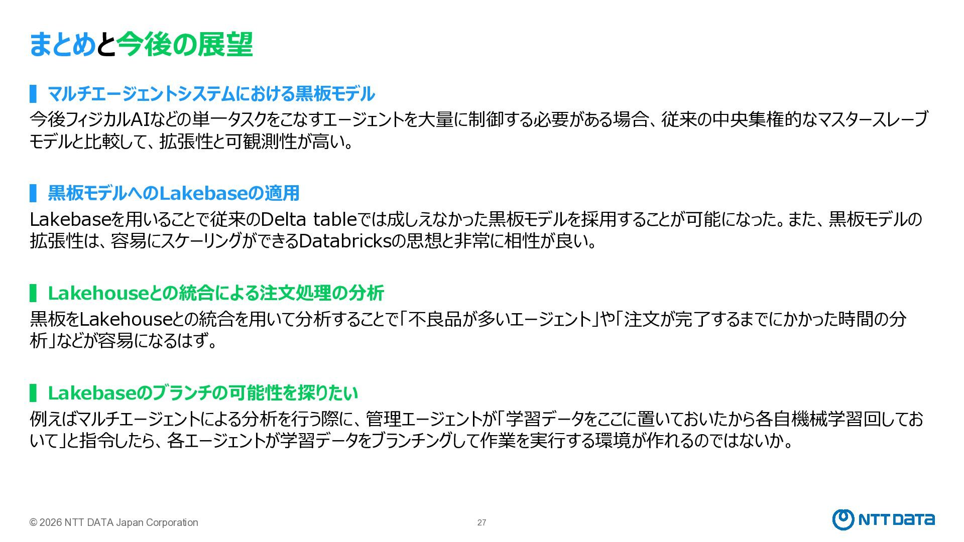 モデルと比較して、拡張性と可観測性が高い。 ▍黒板モデルへのLakebaseの適用 Lakebaseを用いることで従来のDelta tableでは成しえなかった黒板モデルを採用することが可能になった。また、黒板モデルの 拡張性は、容易にスケーリングができるDatabricksの思想と非常に相性が良い。 ▍Lakehouseとの統合による注文処理の分析 黒板をLakehouseとの統合を用いて分析することで「不良品が多いエージェント」や「注文が完了するまでにかかった時間の分 析」などが容易になるはず。 ▍Lakebaseのブランチの可能性を探りたい 例えばマルチエージェントによる分析を行う際に、管理エージェントが「学習データをここに置いておいたから各自機械学習回してお いて」と指令したら、各エージェントが学習データをブランチングして作業を実行する環境が作れるのではないか。