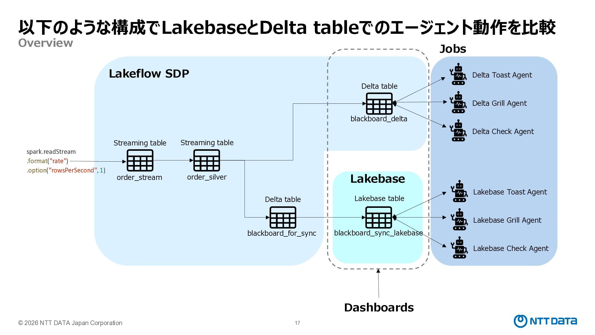 7. © 2026 NTT DATA Japan Corporation 17 以下のような構成でLakebaseとDelta tableでのエージェント動作を比較 Overview