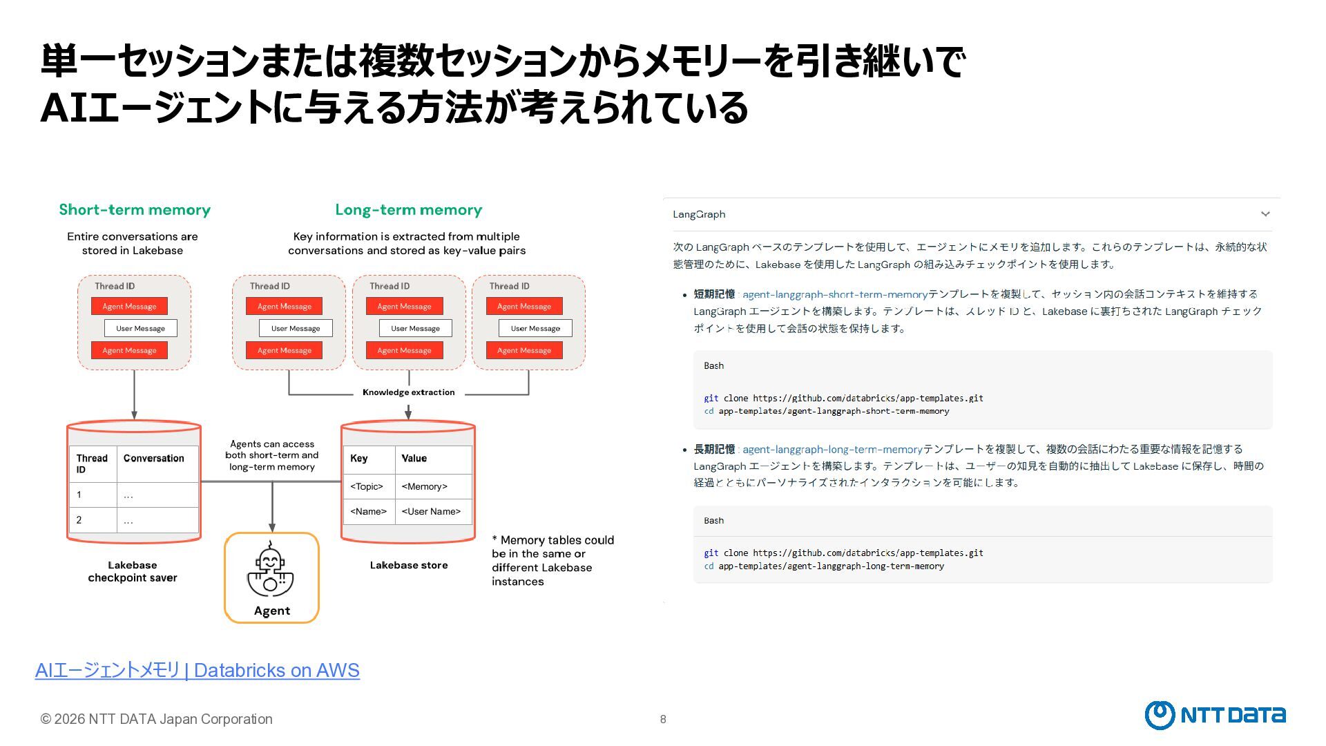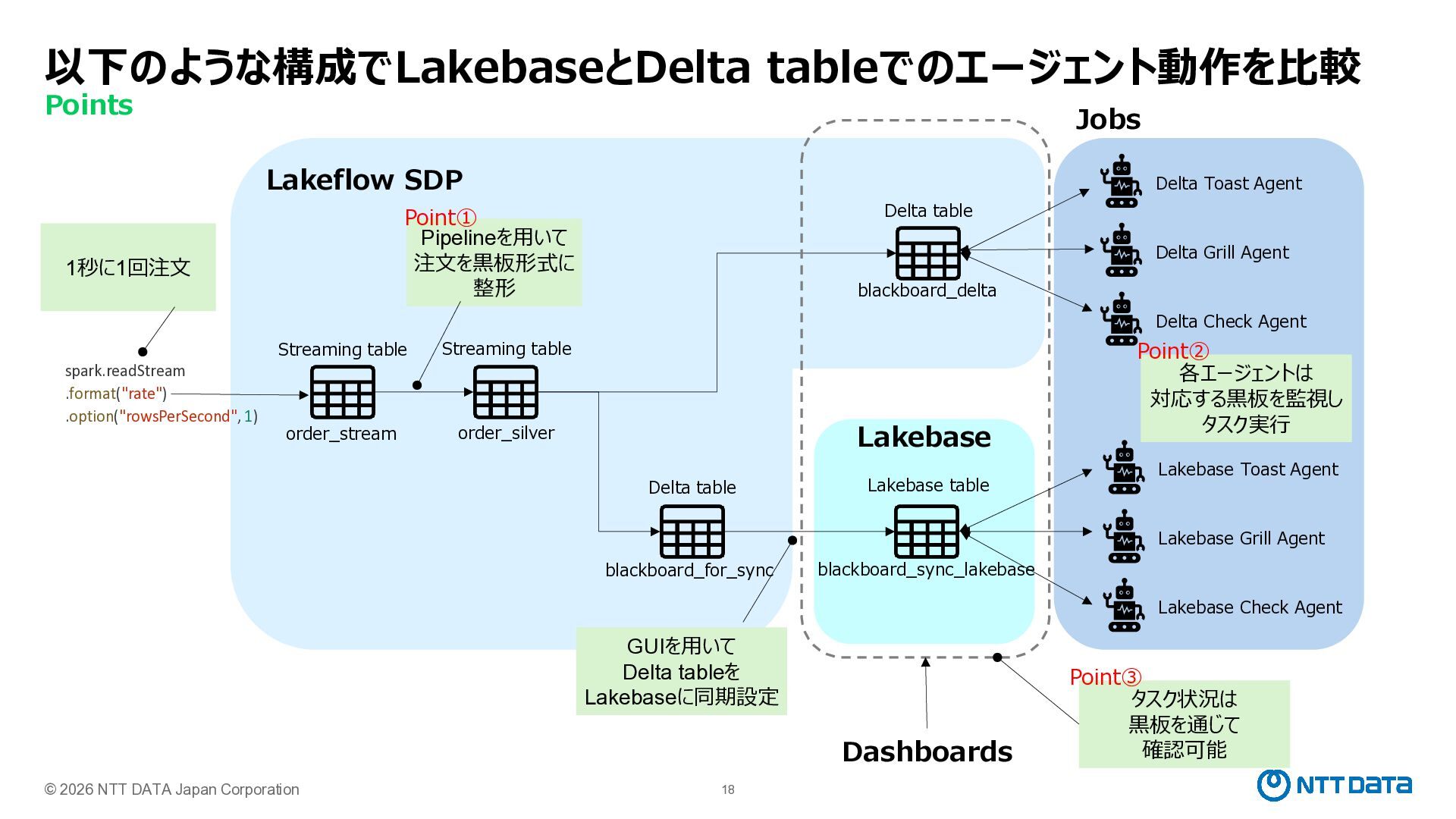 8. © 2026 NTT DATA Japan Corporation 18 以下のような構成でLakebaseとDelta tableでのエージェント動作を比較 Points
